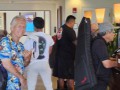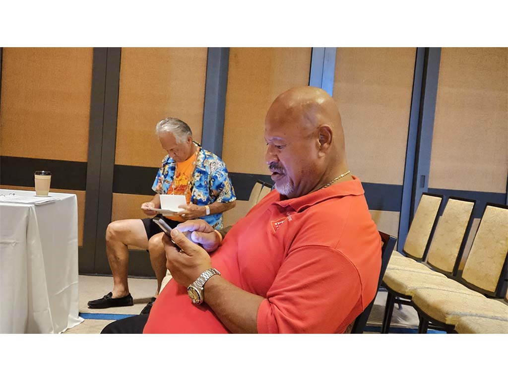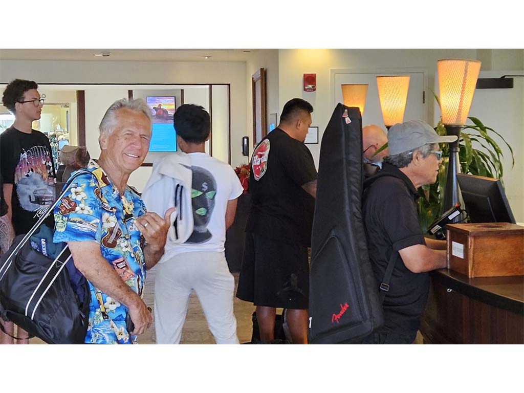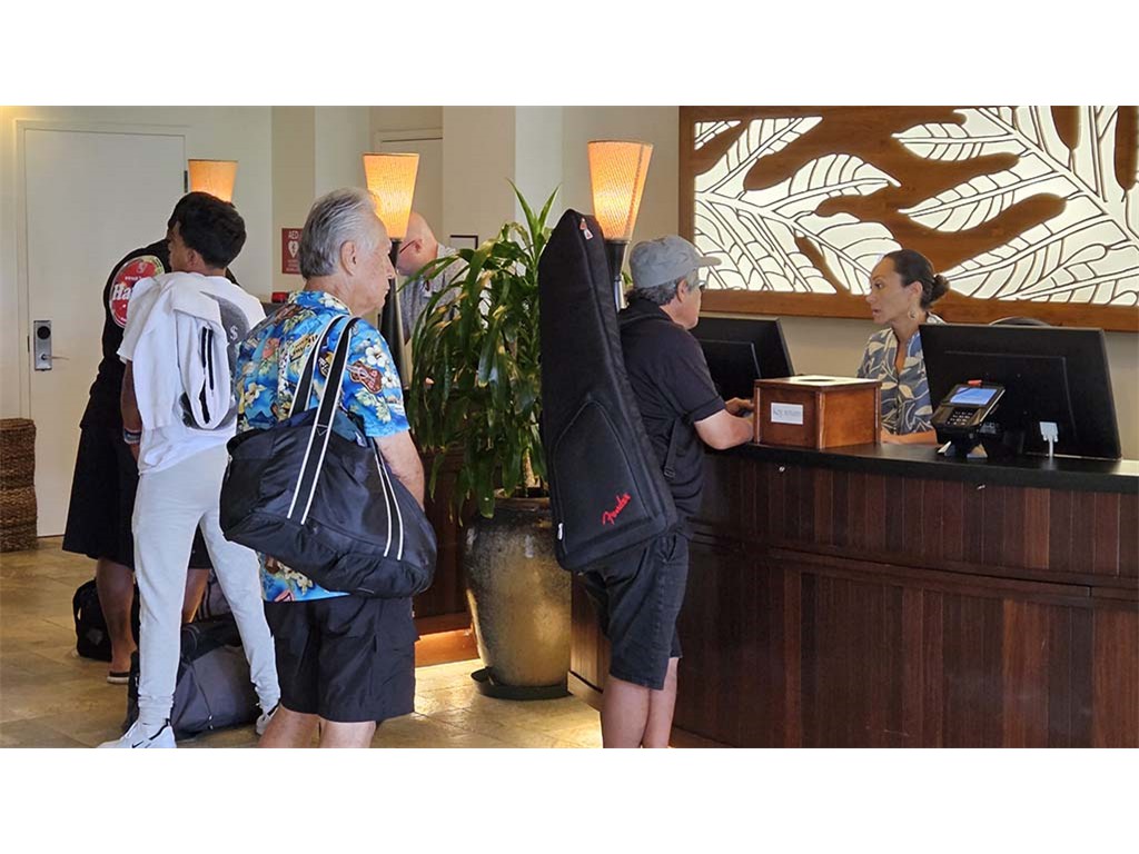 Check-in time for Greg Sardinha. Kimo Kahoano waits his turn. Shane and Enosa Lyman are also checking in.