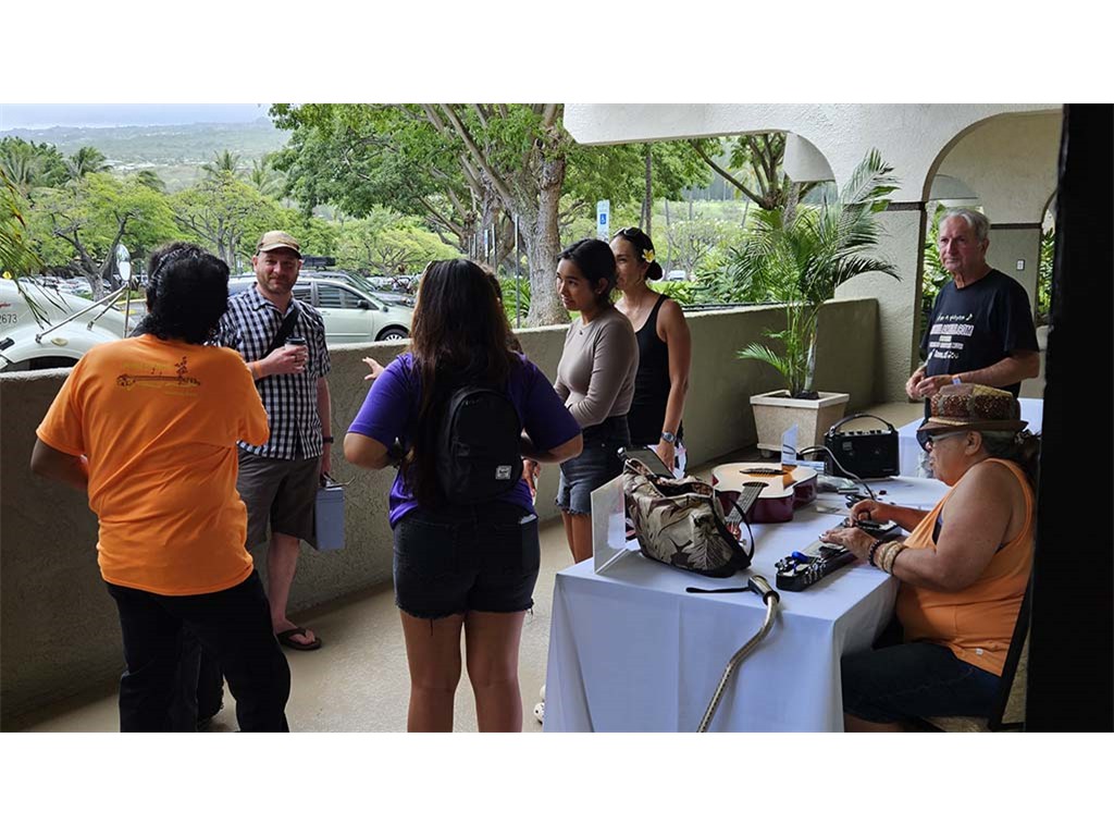 The hands-on experience was located in the ballroom foyer. Lillie Annette Rodrigues tries out a steel guitar while Daniel Tremblay looks on. Bobby Ingano, Aaron Benolkin, Makamae Lyu-Naponeon, Isabella Bertelmann and mom Donnica Bertelmann chat in the foyer.
