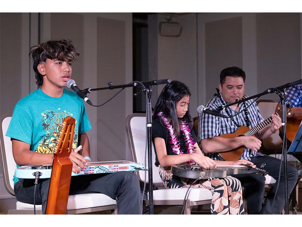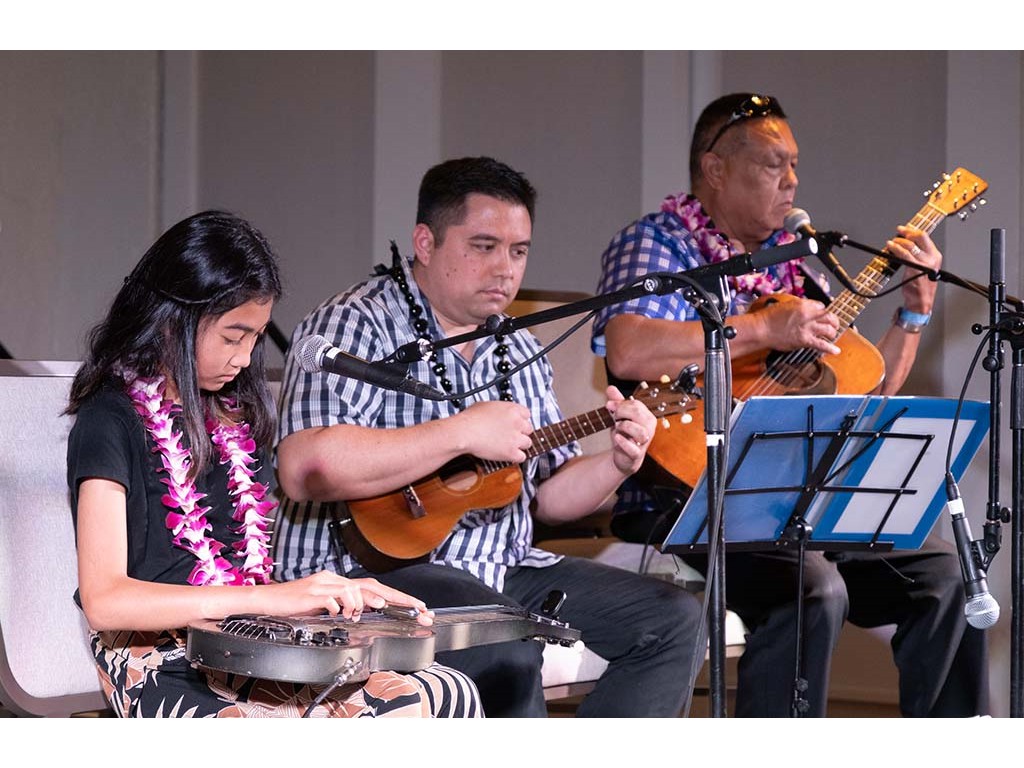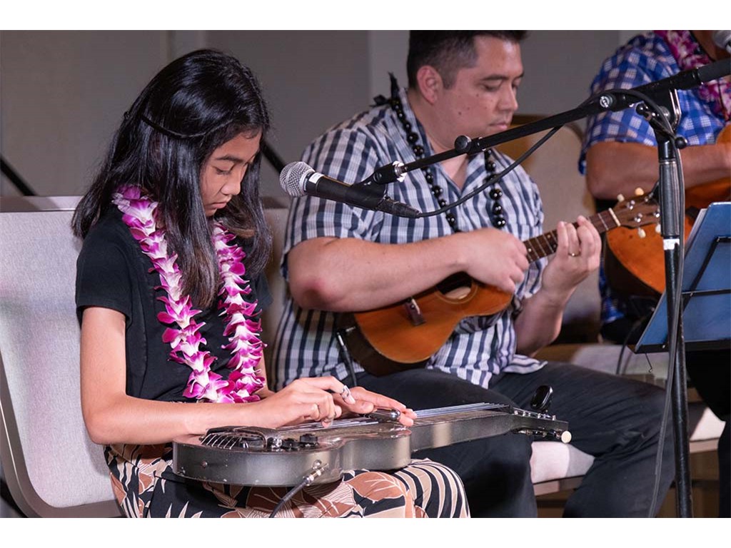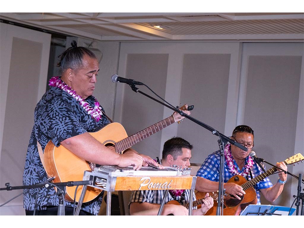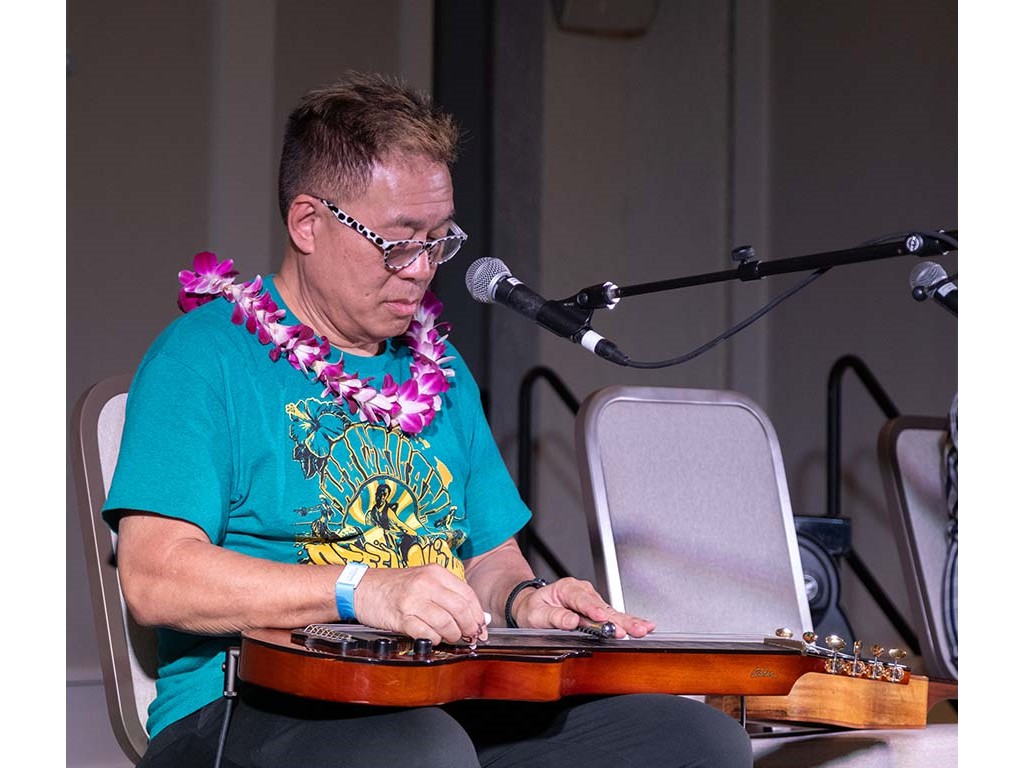 Featured steel guitarist Pōmai Brown. Pōmai played both the guitar and the Hawaiian steel guitar in his performance.