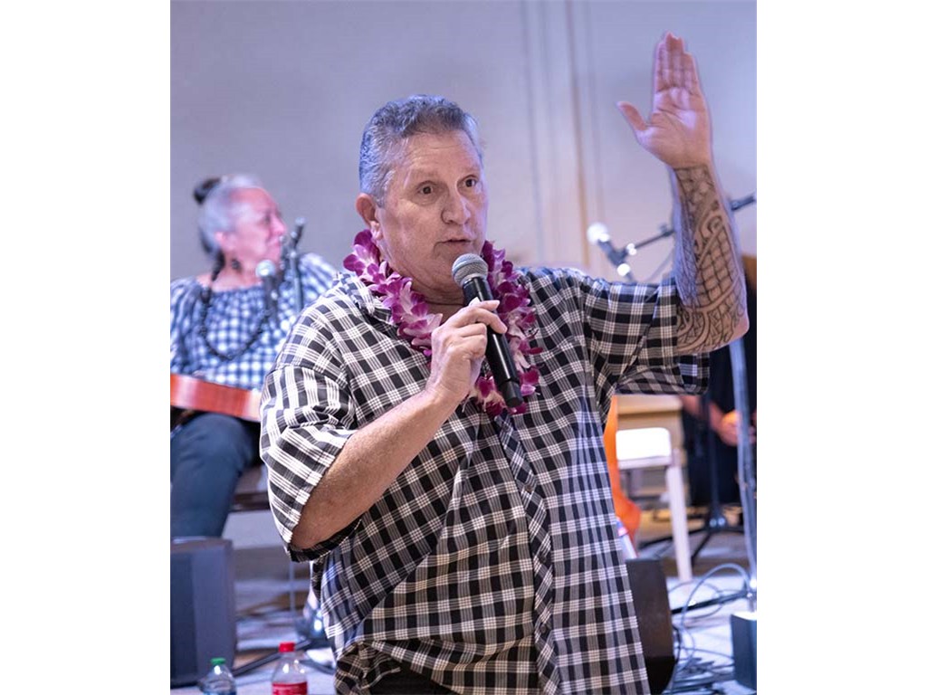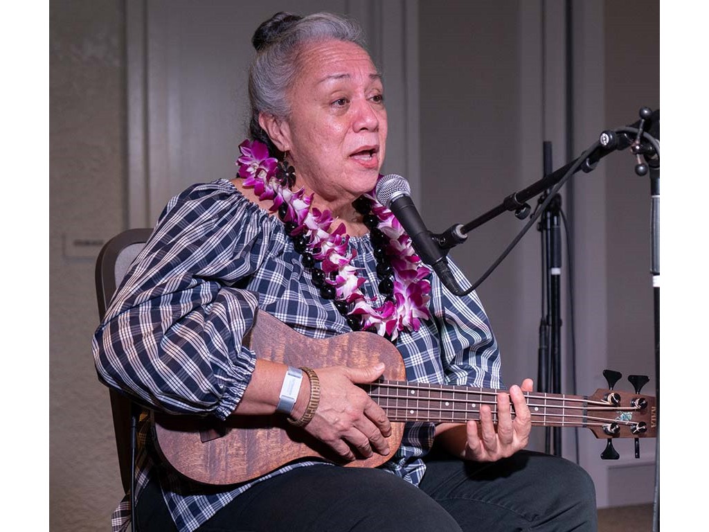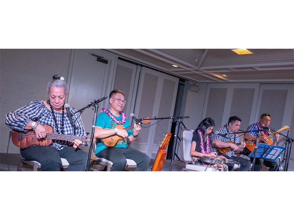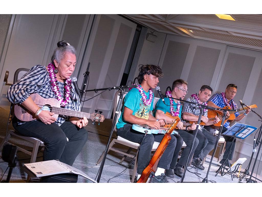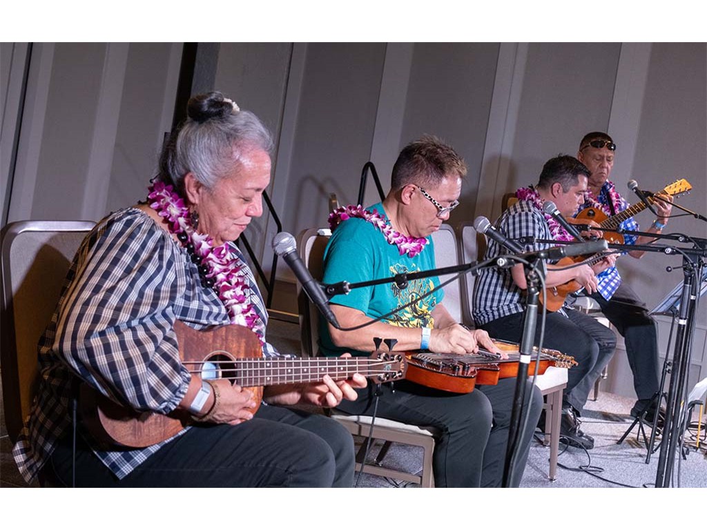 Featured steel guitarist Pōmai Brown. Pōmai played both the guitar and the Hawaiian steel guitar in his performance.