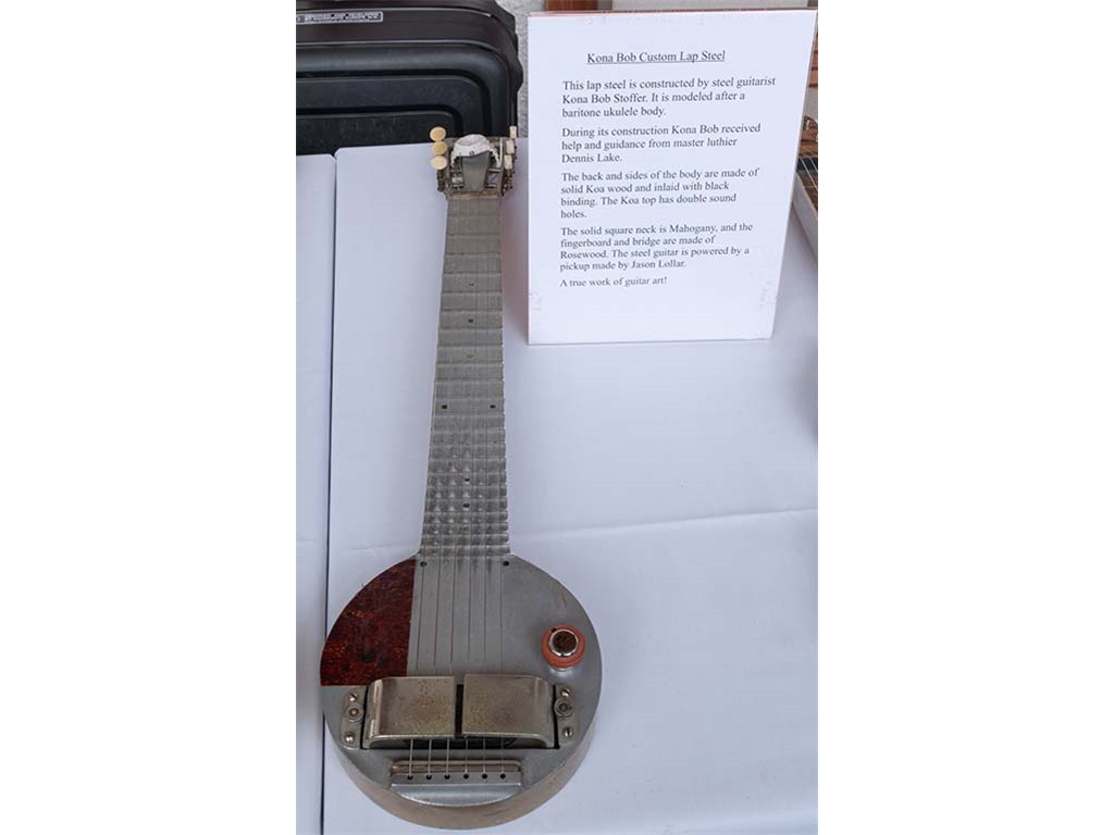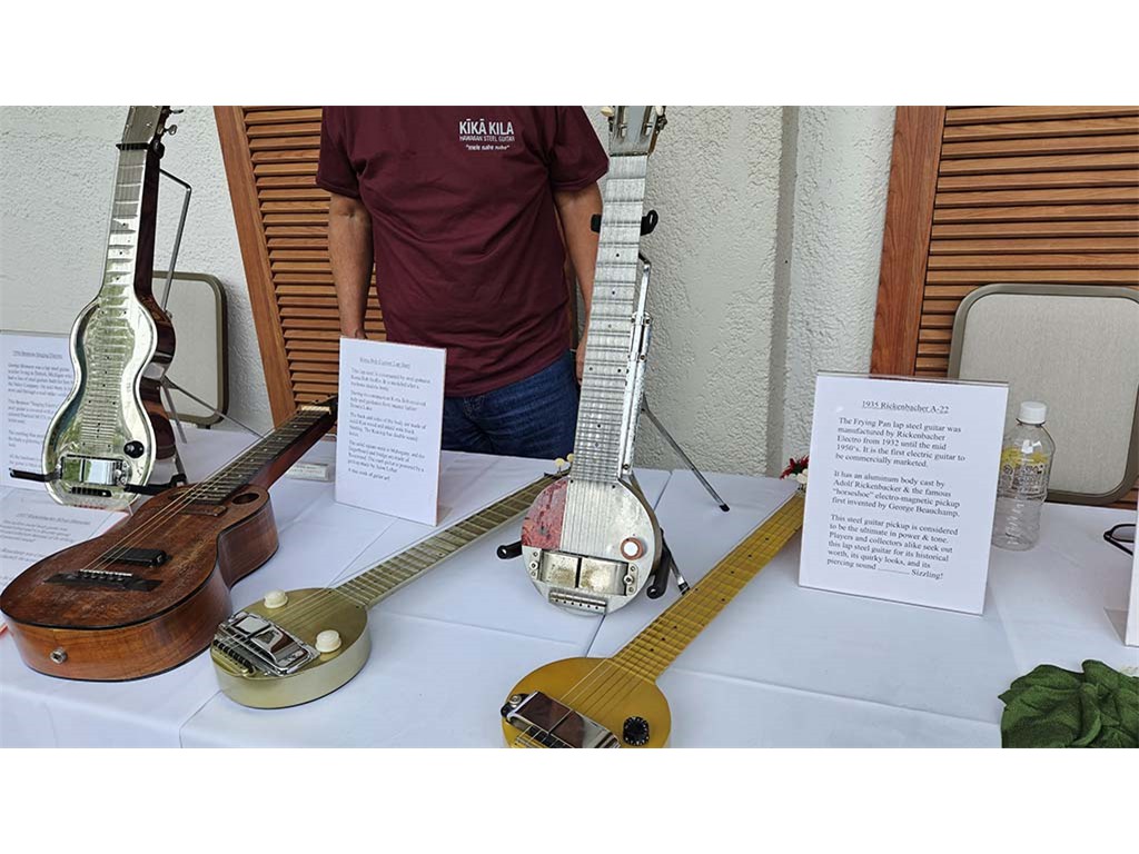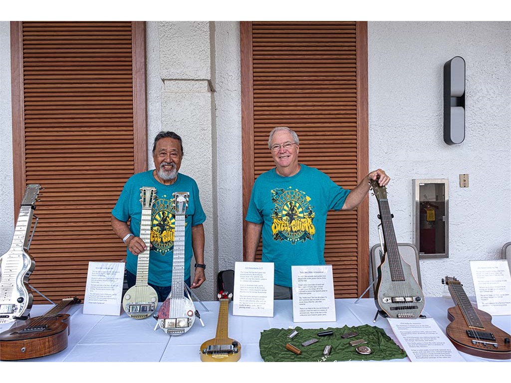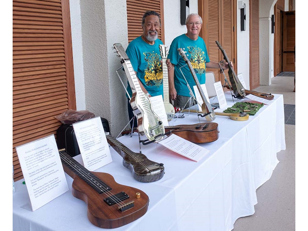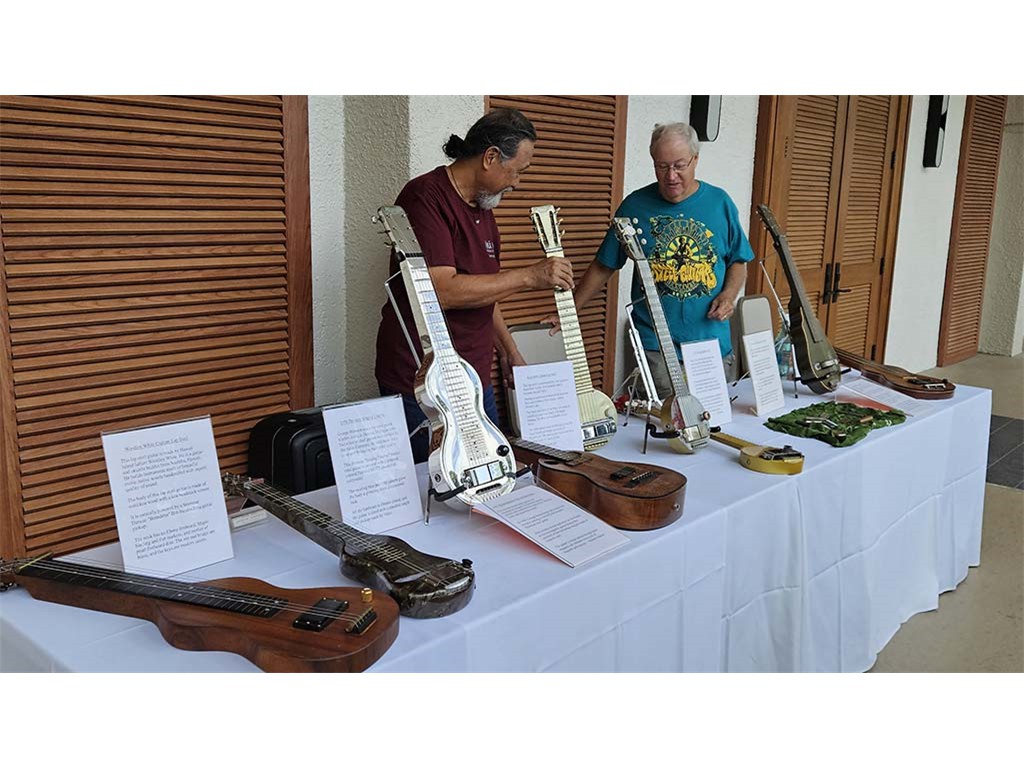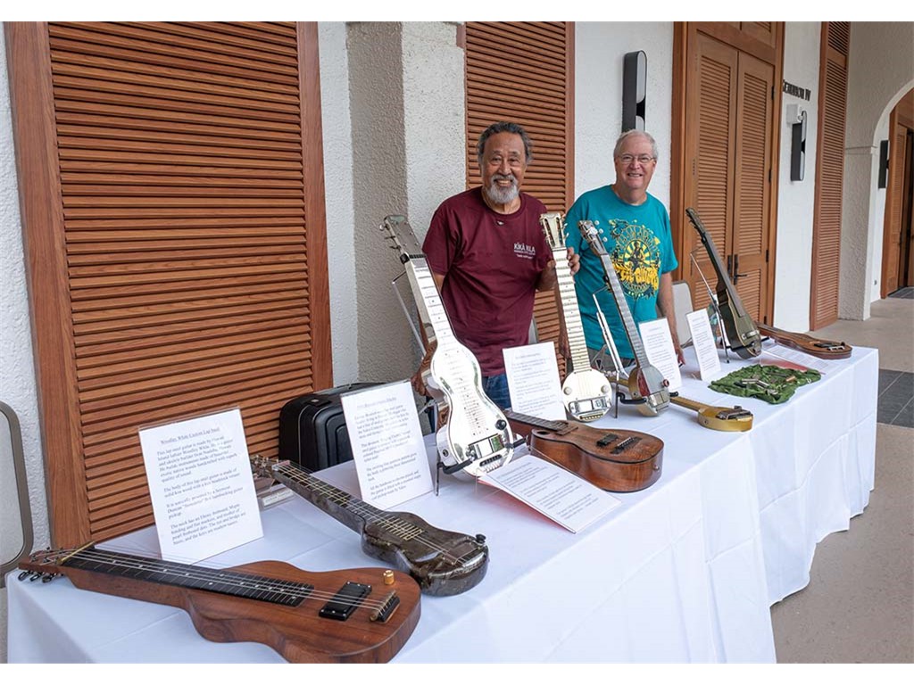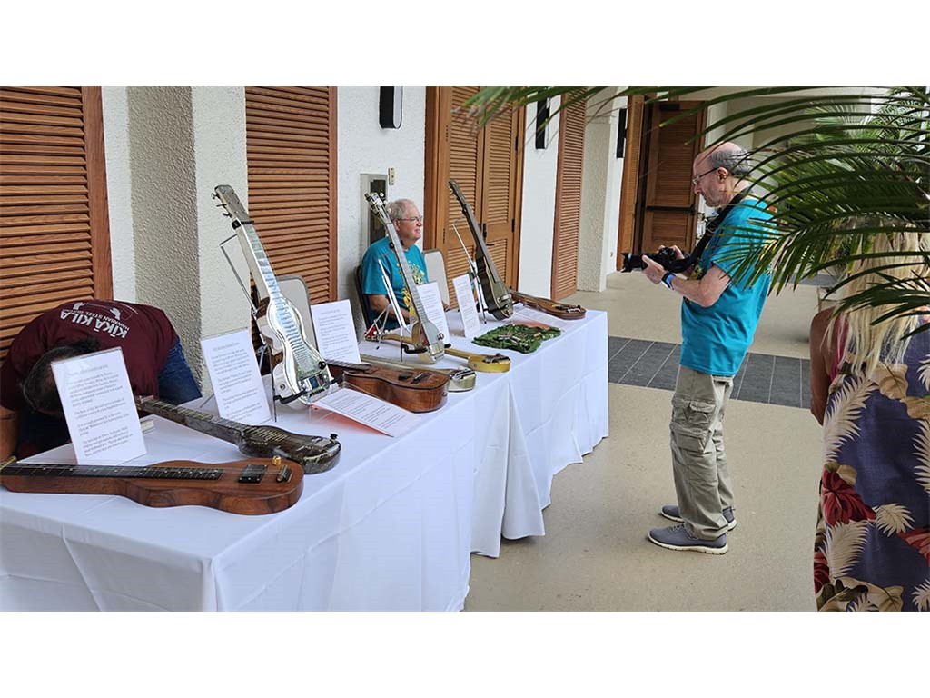 The steel guitar exhibit was located in the Keauhou Ballroom foyer and managed by Geri Valdriz and Chris Stewart. The exhibit included vintage RIckenbacher lap steel guitars as well as custom-crafted lap steel guitars made by Hawai‘i Island luthiers Chris Stewart, Konabob Stoffer, and Woodley White.