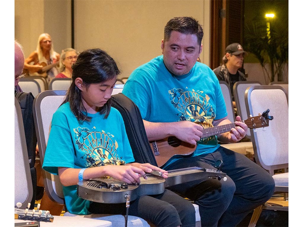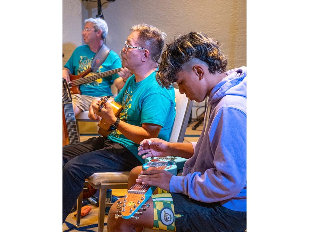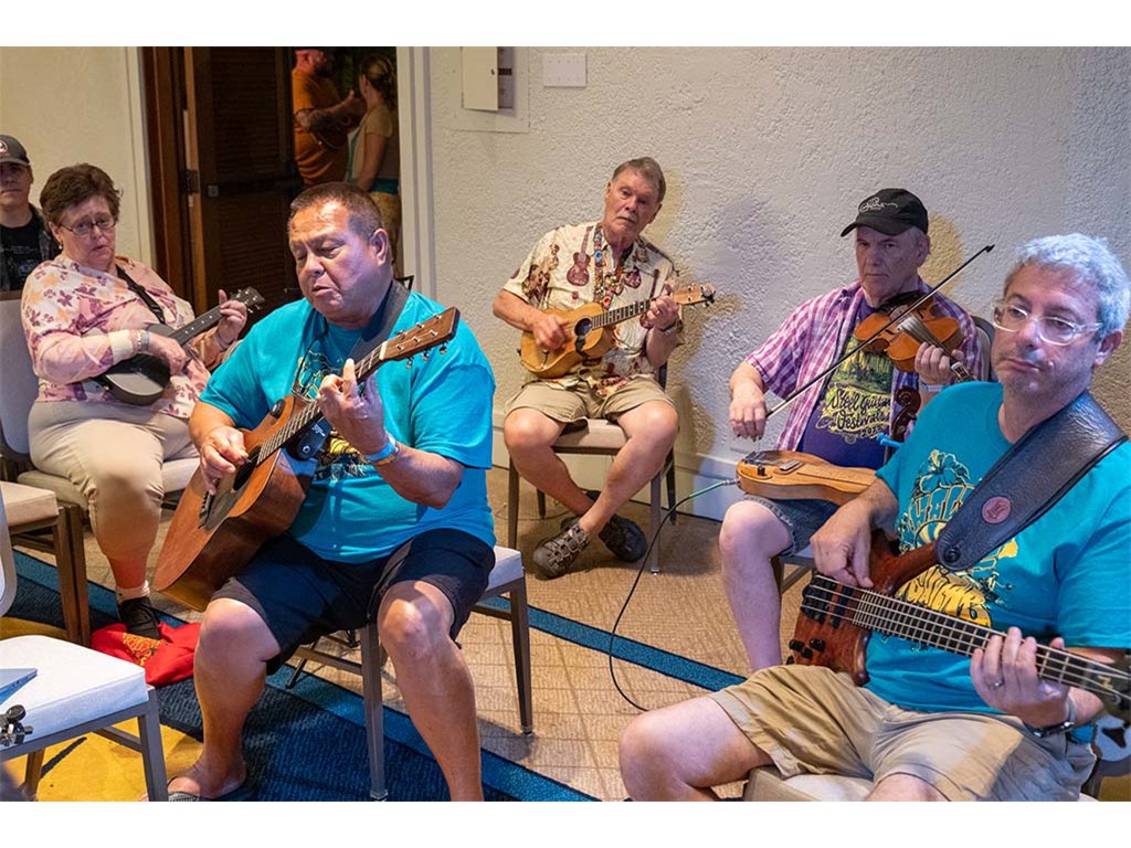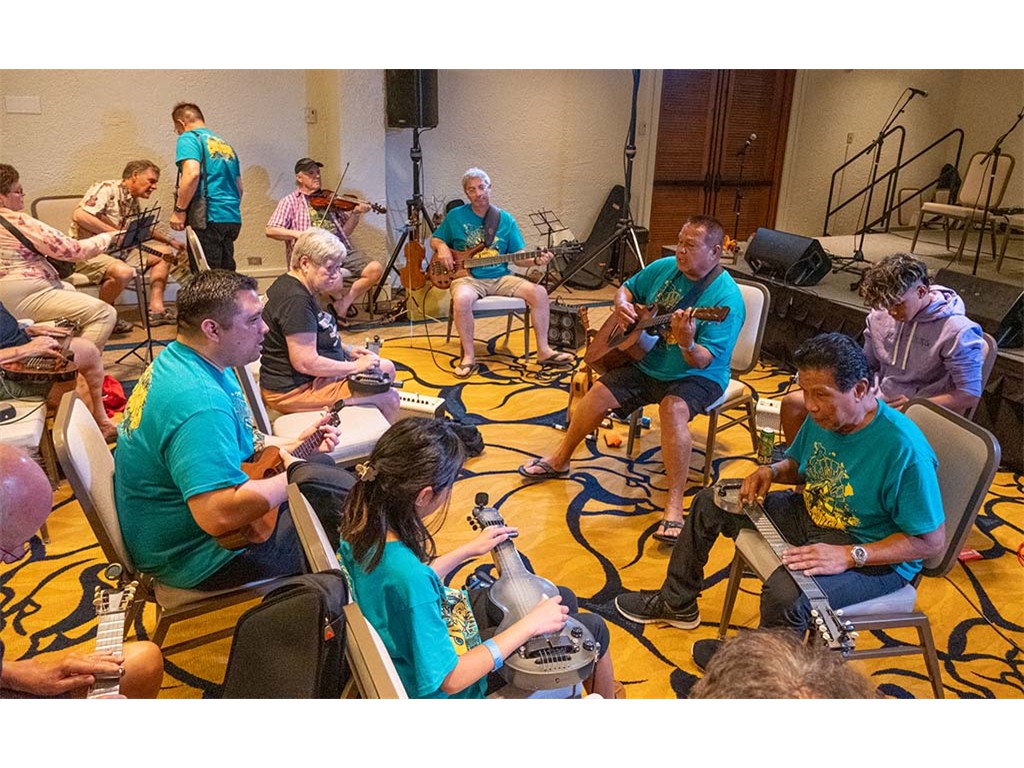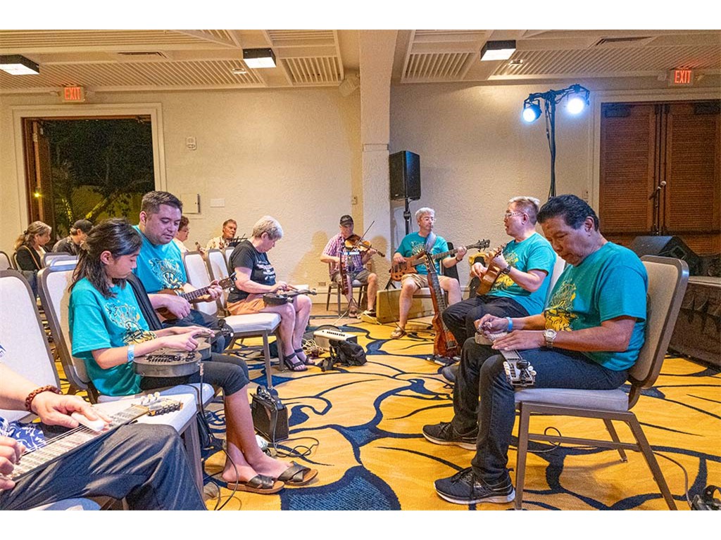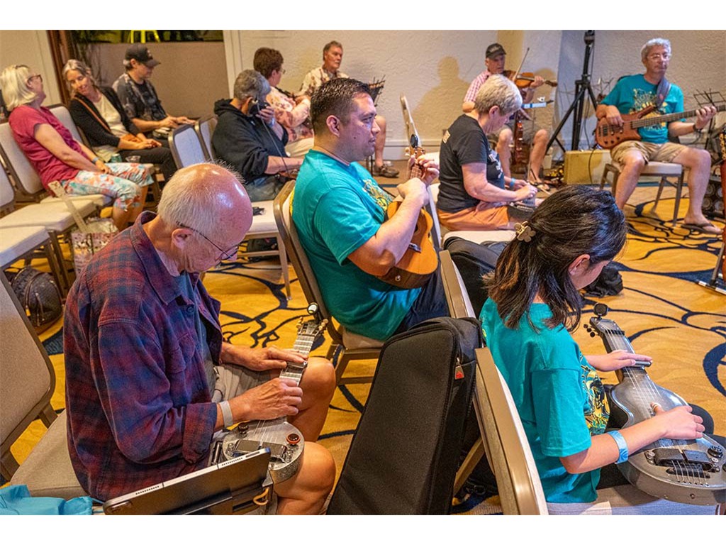 The Friday Evening Kanikapila was well attended by festival musicians, steel guitarists, other musicians and festival guests who just wanted to watch and enjoy the music. In addition to steel guitars, guests played guitar, ‘ukulele, and fiddle. A few guests brought multiple instruments to play.