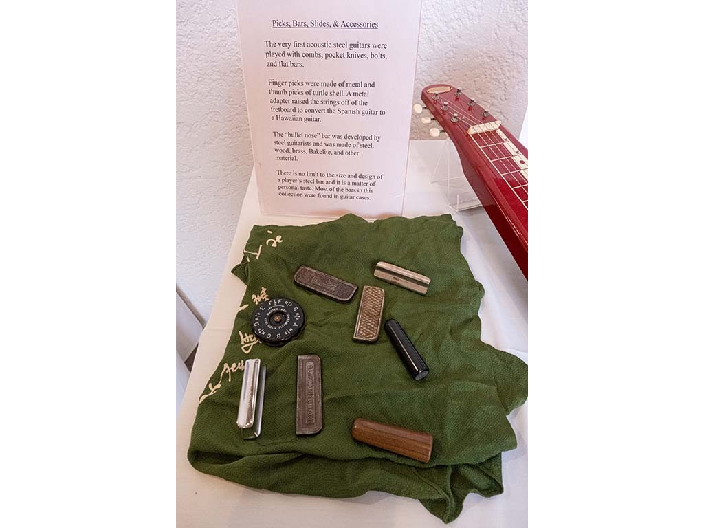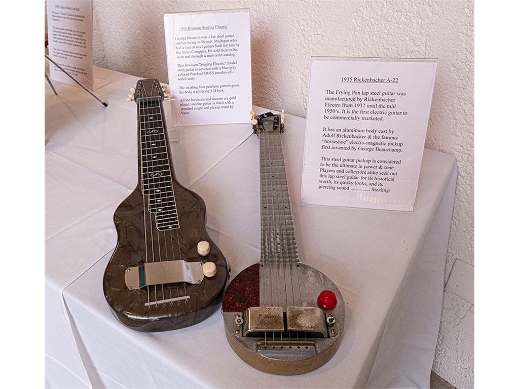 Steel guitars on display: L-1956 Bronson Singing Electric. R-1935 Rickenbacher A-22 frypan.