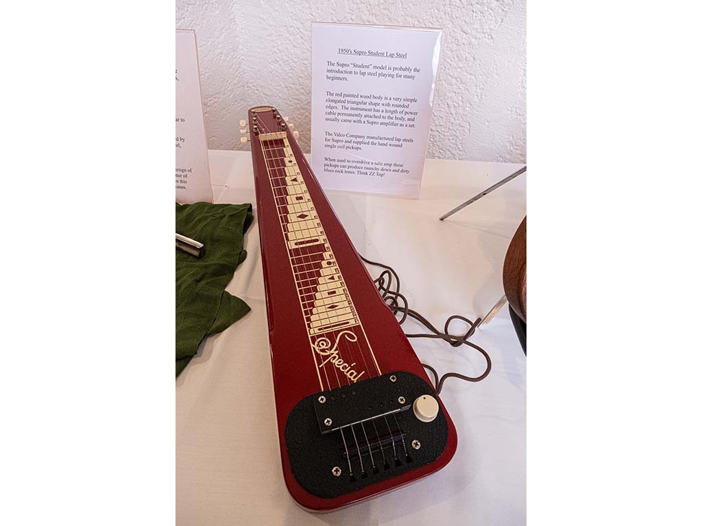 Steel guitars on display: A Supro student lap steel from the 1950s.