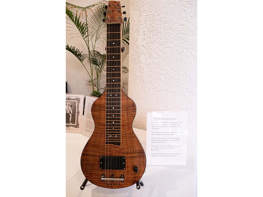 Steel guitars on display: A custom lap steel guitar made by Hawaiian luthier Chris Stewart from Kona.