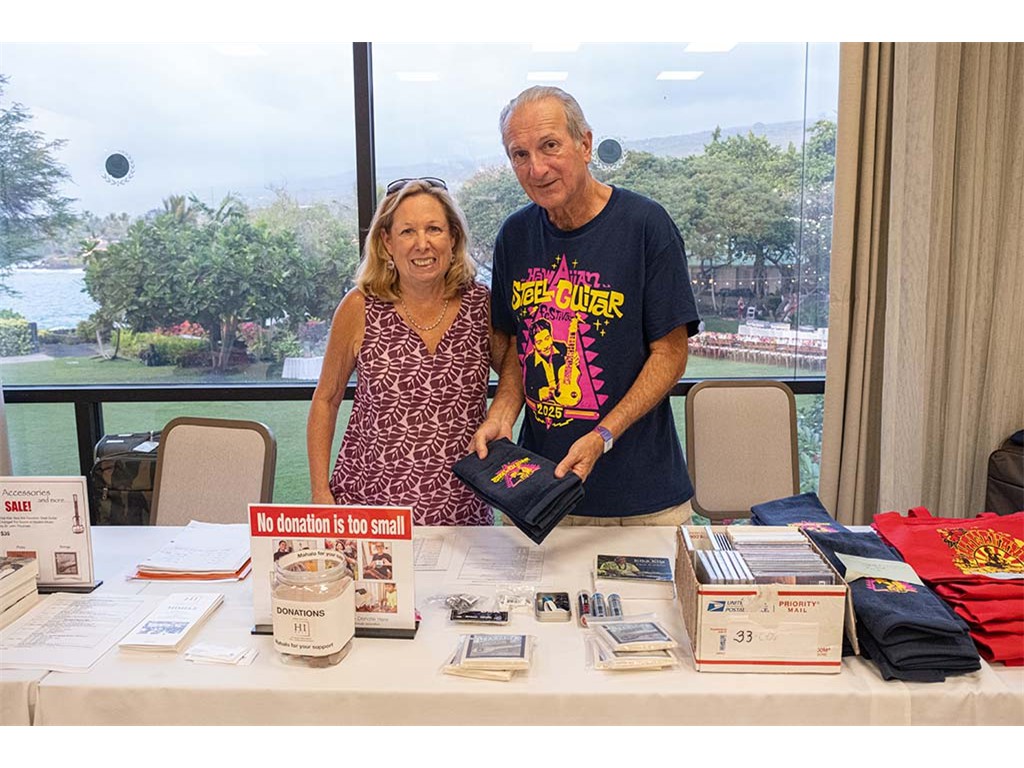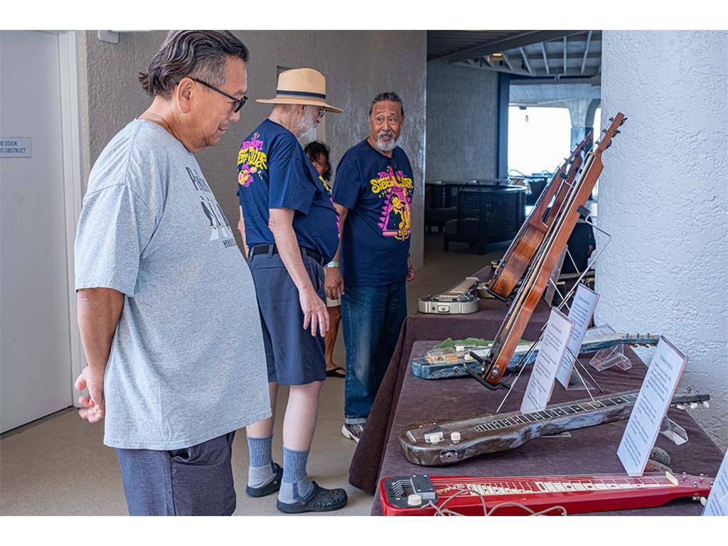 The steel guitar exhibit was located in the Keauhou Ballroom foyer and managed by Geri Valdriz and Chris Stewart. The exhibit included vintage RIckenbacher lap steel guitars as well as custom-crafted lap steel guitars made by Hawai‘i Island luthiers Chris Stewart, Konabob Stoffer, and Woodley White.
