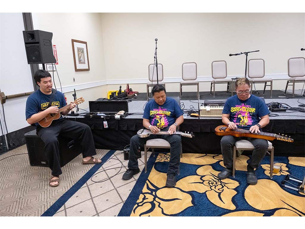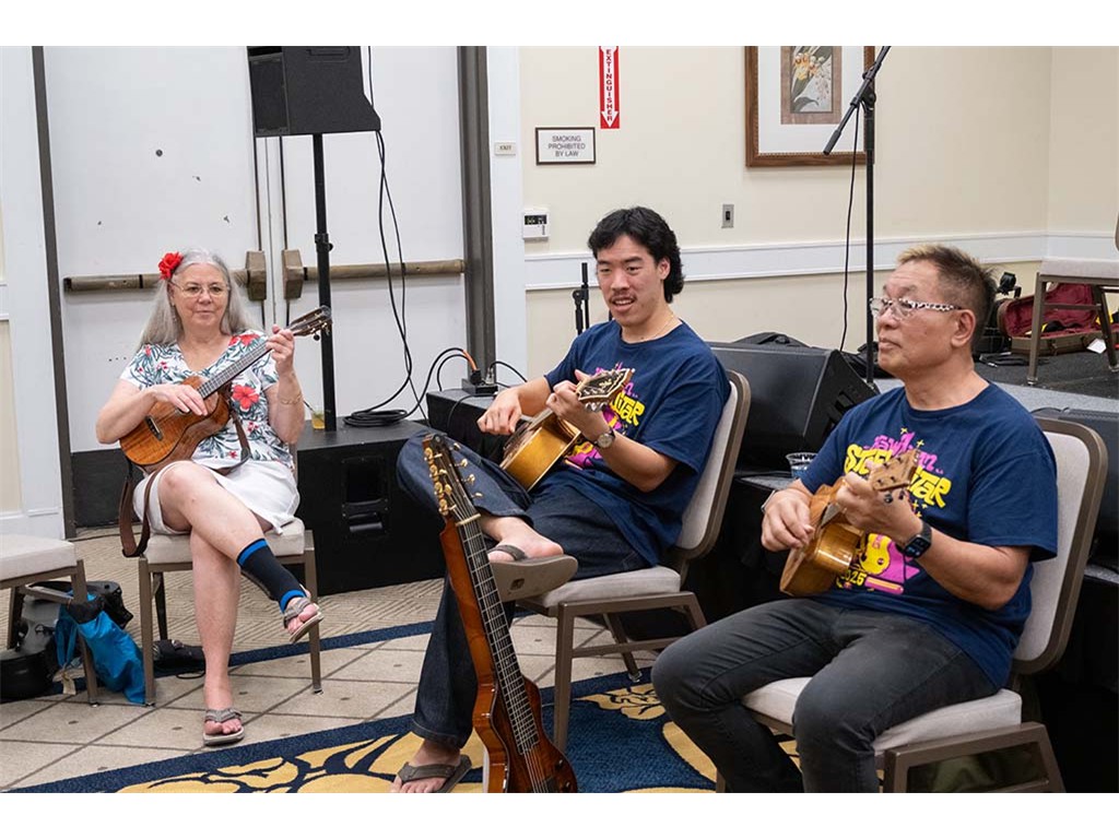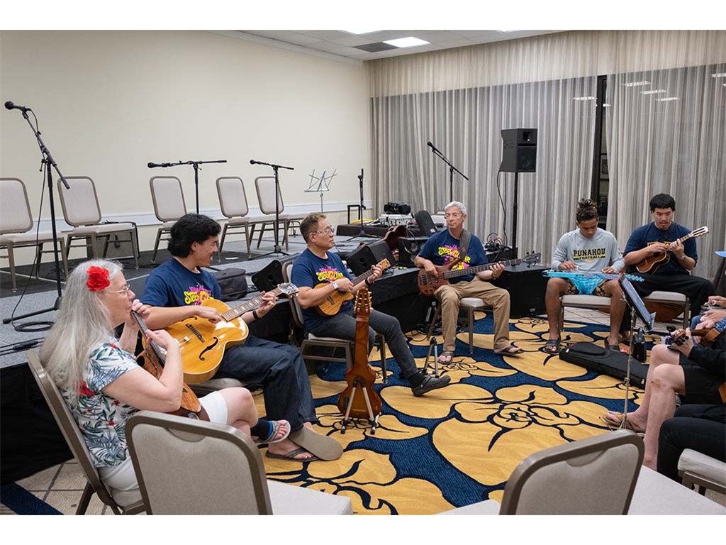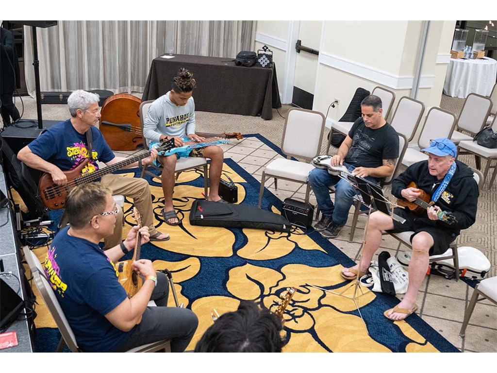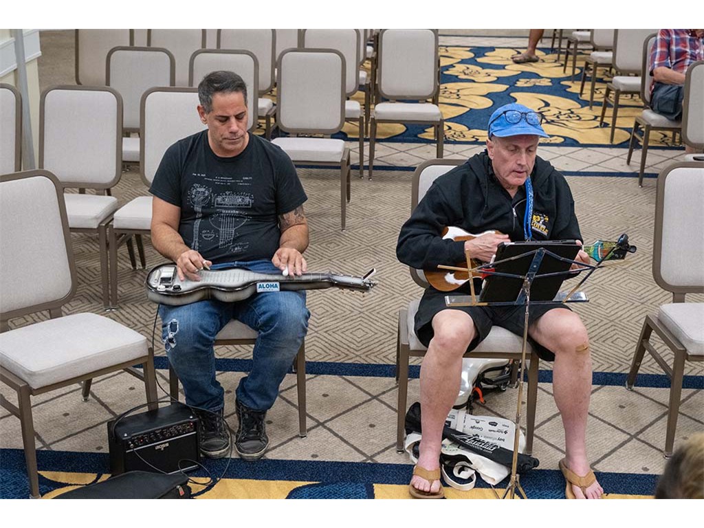 The Friday Evening Kanikapila evolved from the workshop held prior to the kanikapila and was well attended by festival musicians, steel guitarists, other musicians and festival guests who just wanted to watch and enjoy the music. In addition to steel guitars, guests played guitar, ‘ukulele, and bass, and many musicians switched off on instruments.
