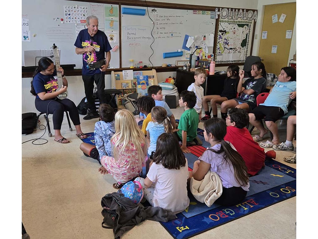 A presentation team comprising NextGen Makamae Lyu-Napoleon and Dan Tremblay visited Hōluoaloa Elementary School. Students in Taylor Deskin's 3rd grade class were treated to a steel guitar presentation.