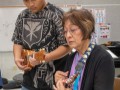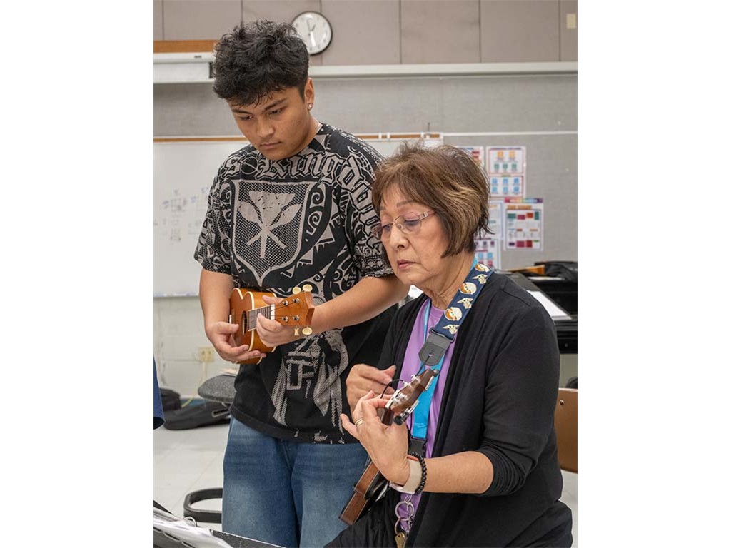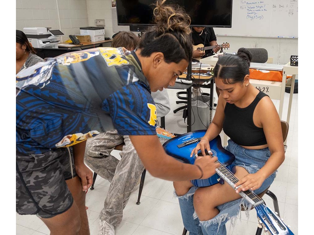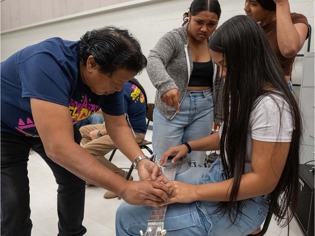 Kaipo helps a student maneuver the fretboard.