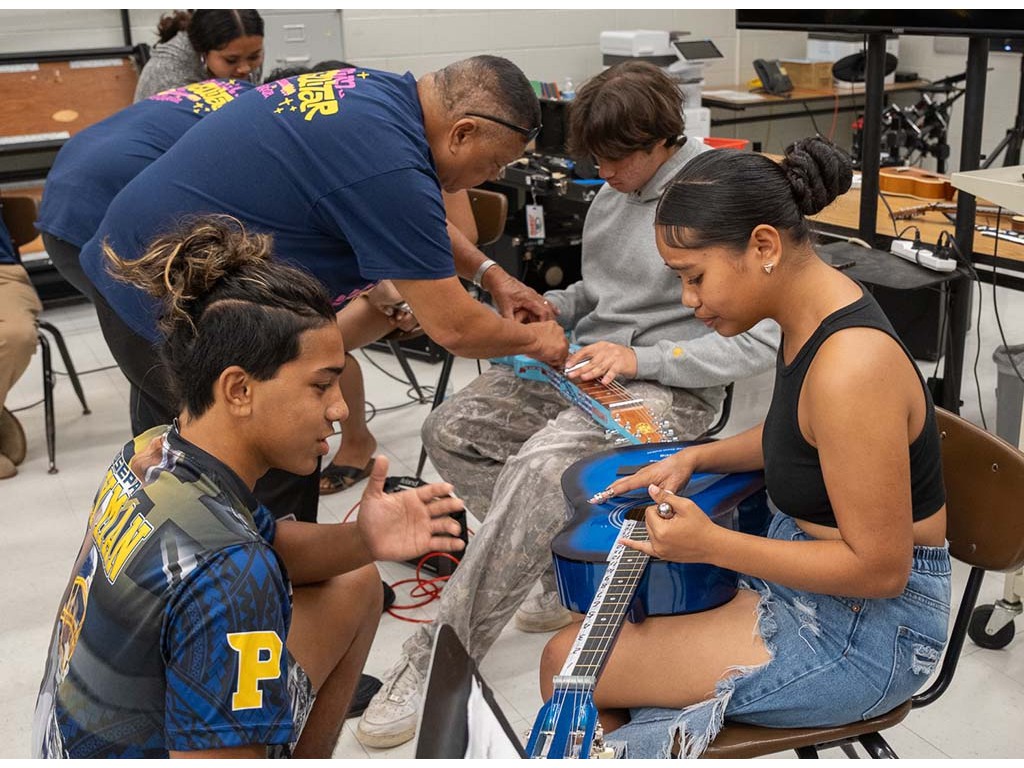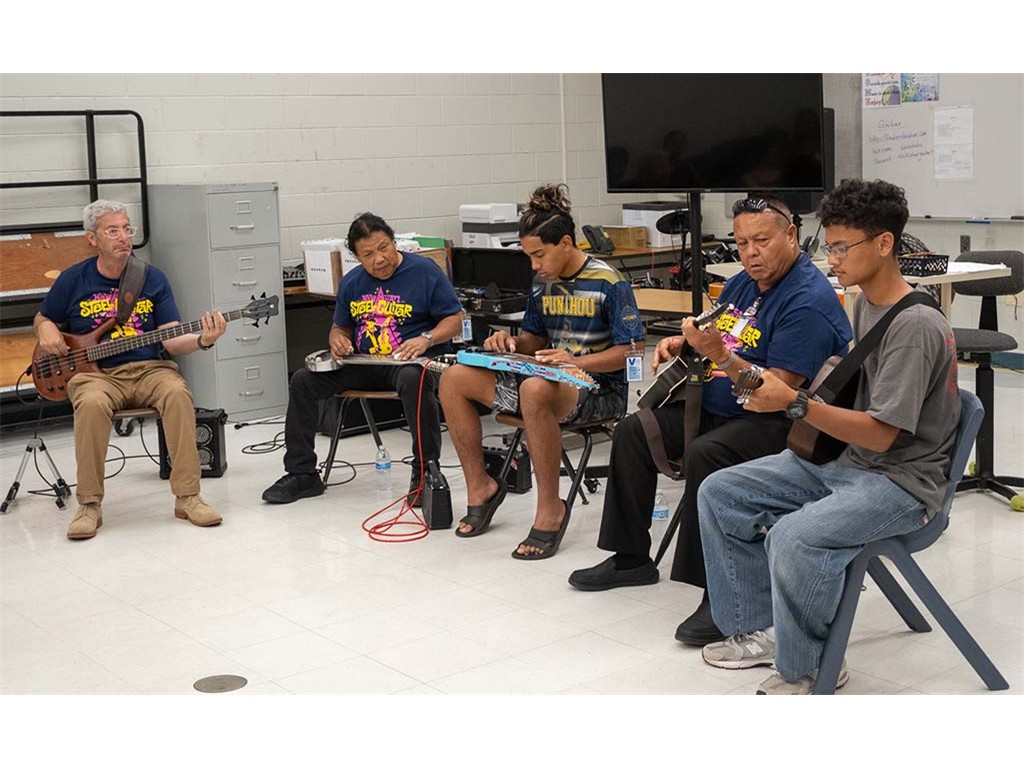 A presentation team comprising Nate Goore, Bobby Ingano, Kaipo Asing, and NextGen Enosa Lyman visited Kealakehe High School. The group gave a presentation to Linda Nagai's class then showed students how to play the steel guitar.