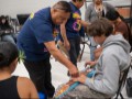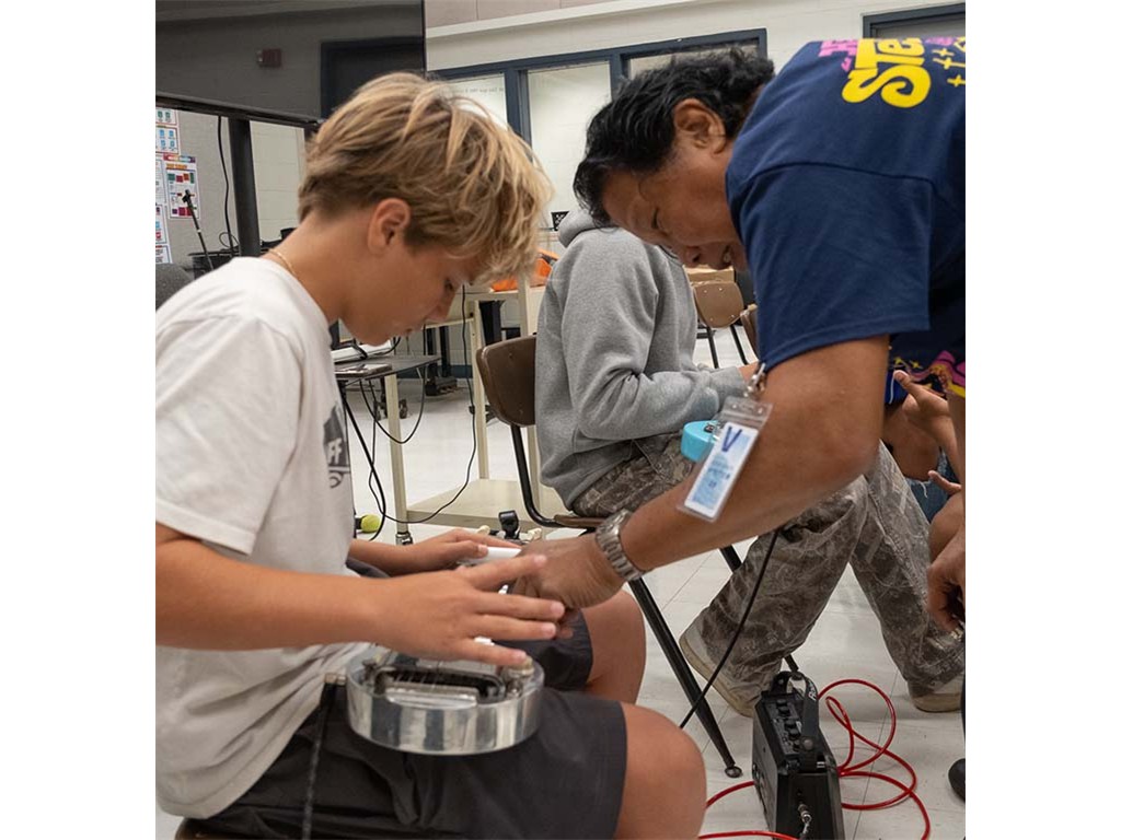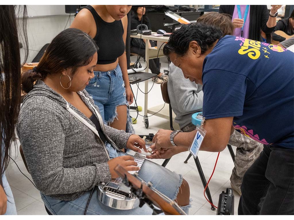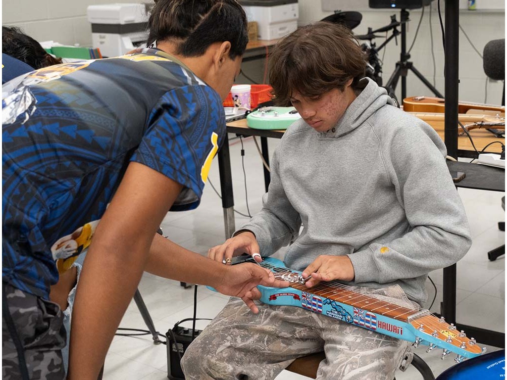 Enosa shows a student how to play the acousitc steel guitar.,