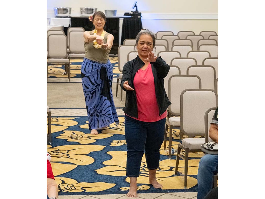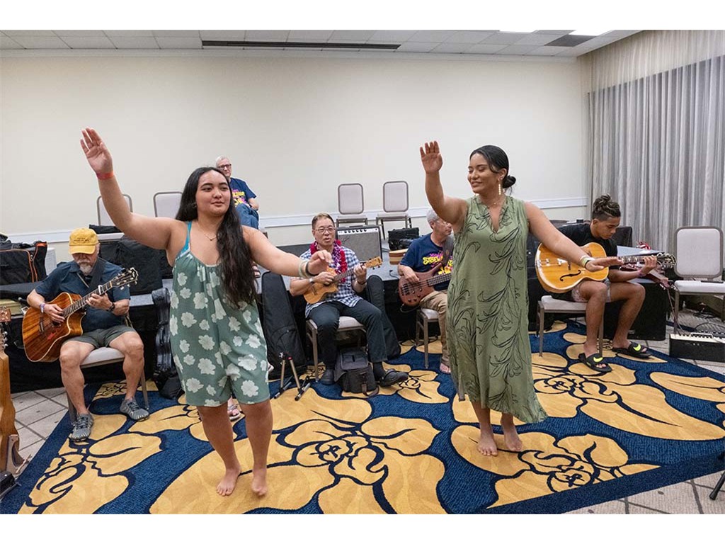 Makamae Lyu-Napoleon and Mālie Lyman doing the hula.