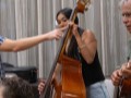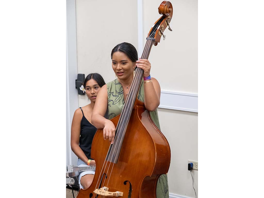 Dylan Nakahara showing Isabella Bertelmann how to play the upright bass.
