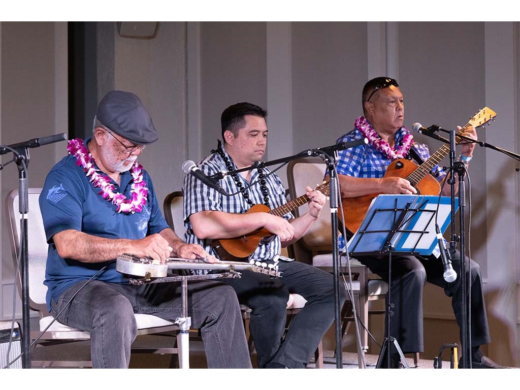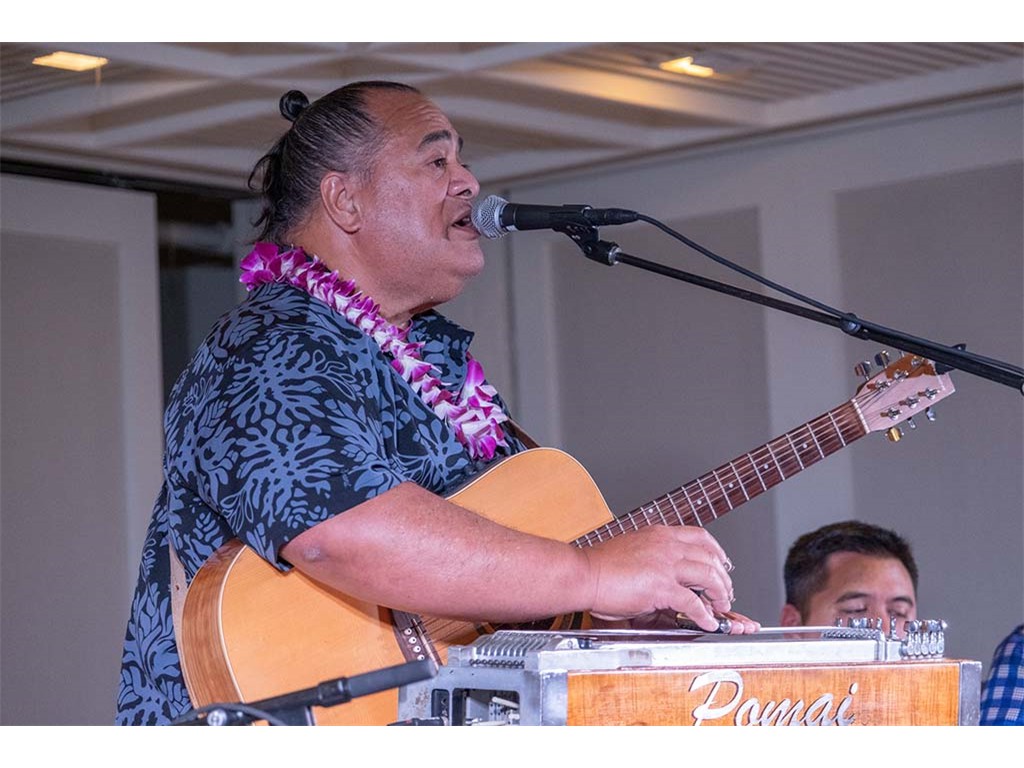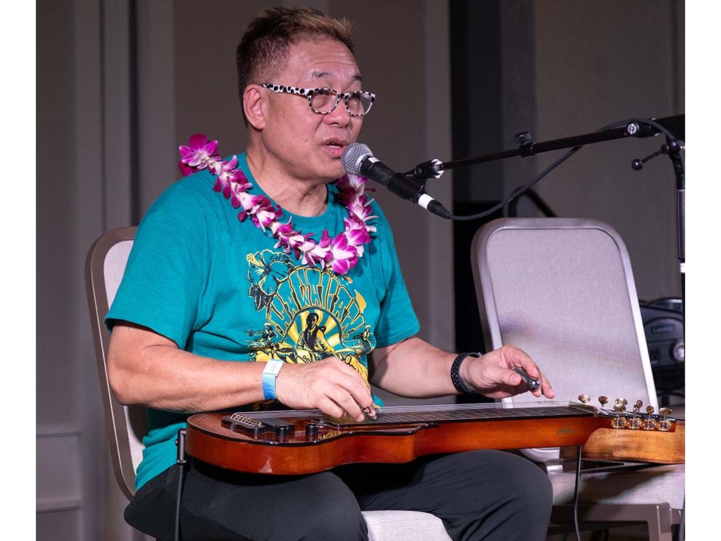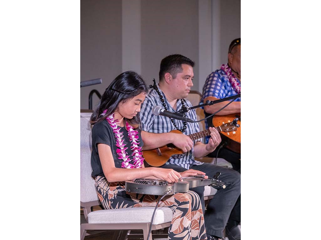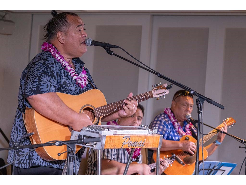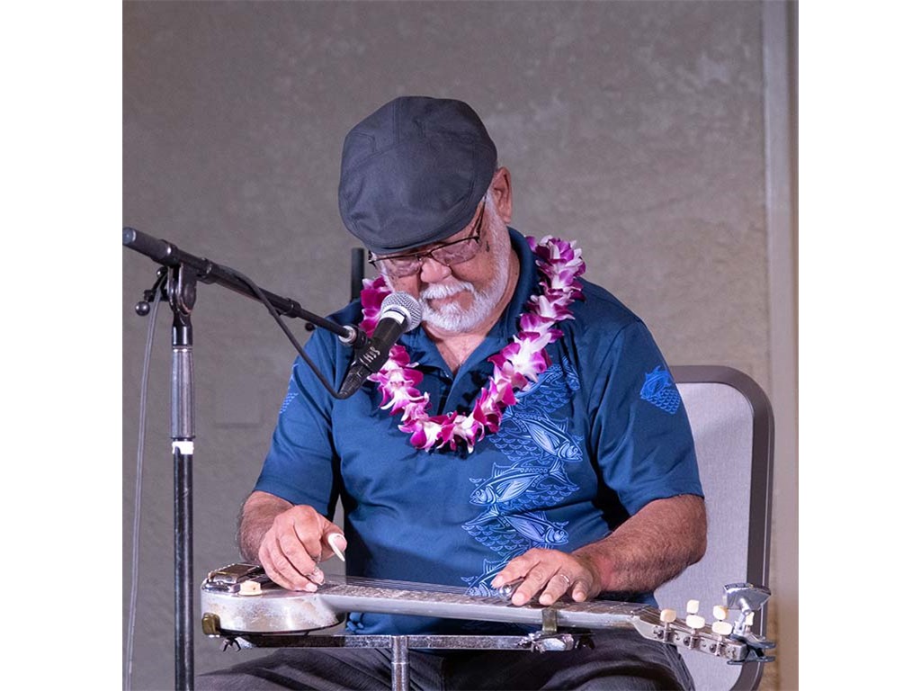 Featured steel guitarist Pōmai Brown. Pōmai played both the guitar and the Hawaiian steel guitar in his performance.
