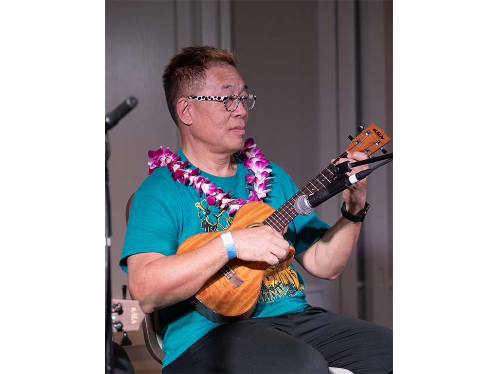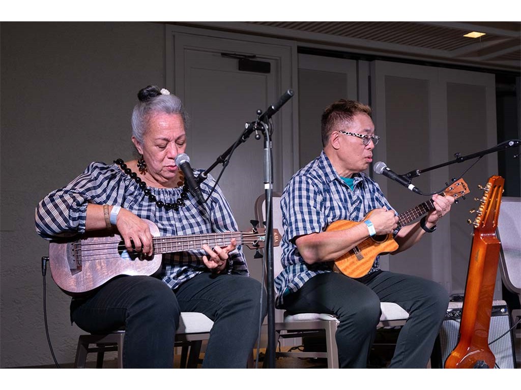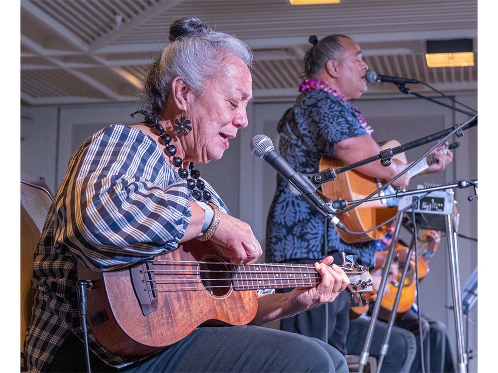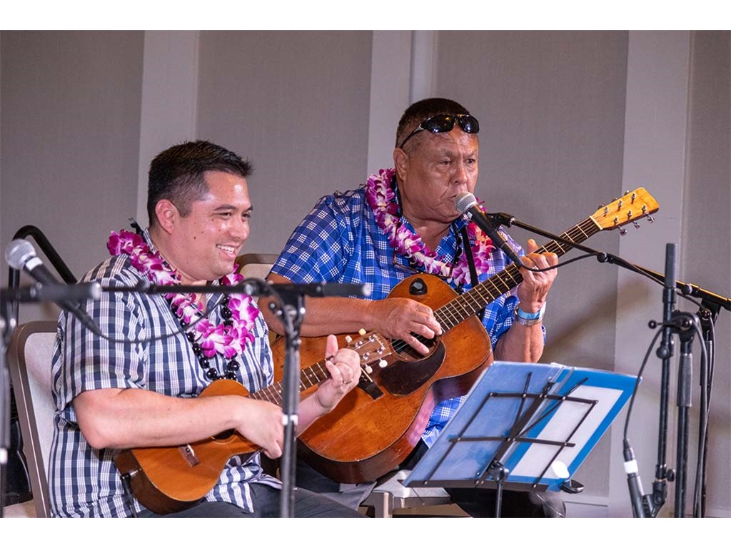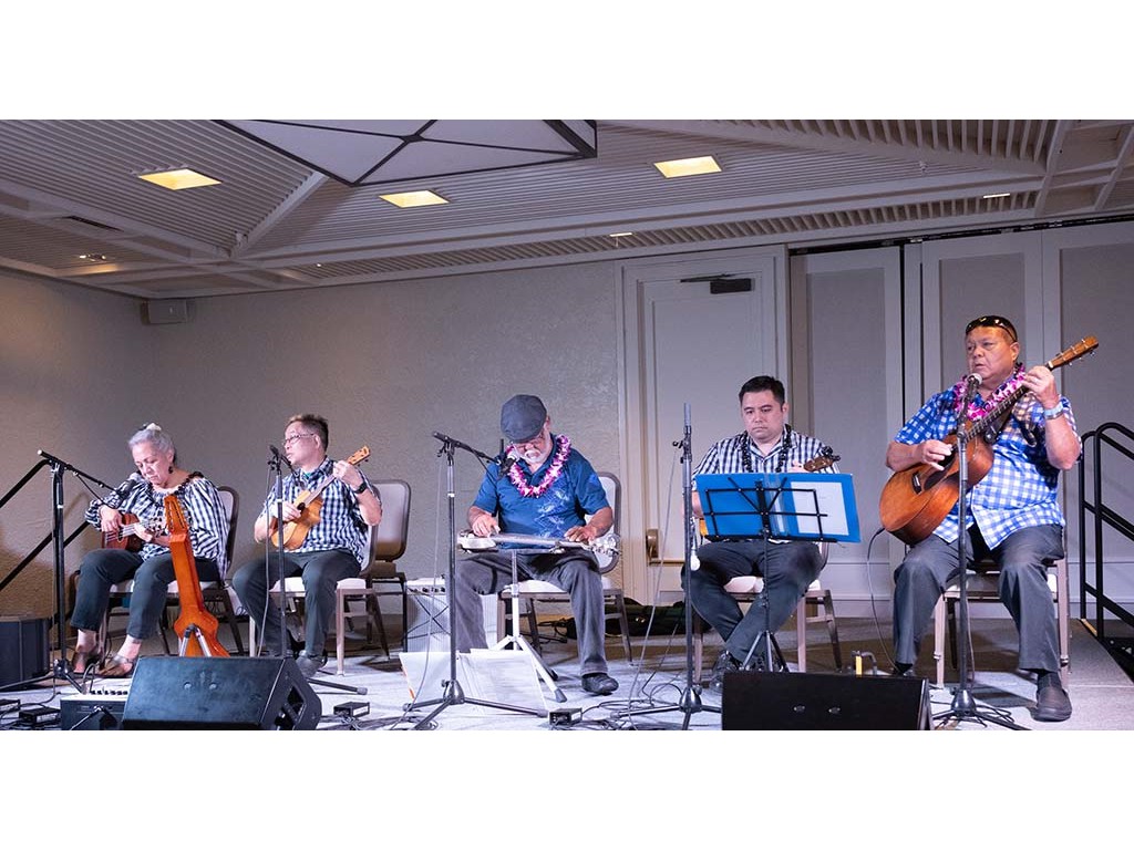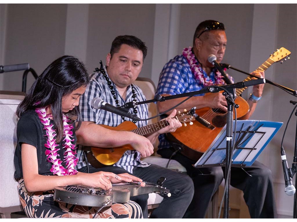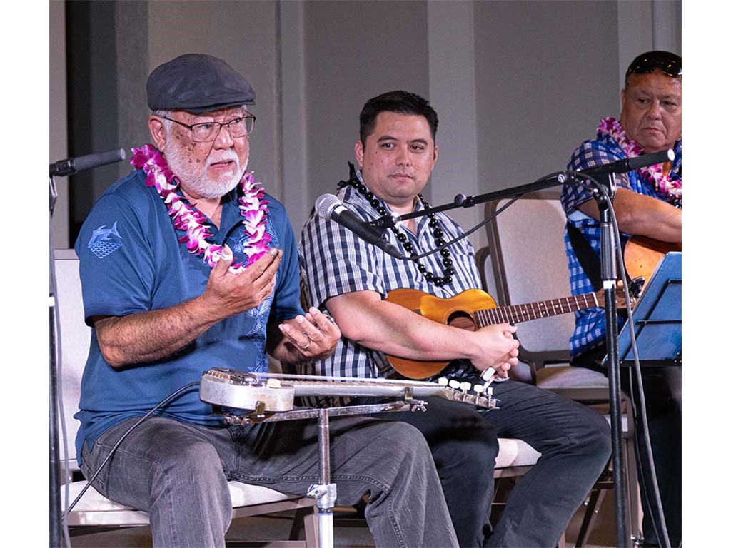 Featured steel guitarist Pōmai Brown. Pōmai played both the guitar and the Hawaiian steel guitar in his performance.