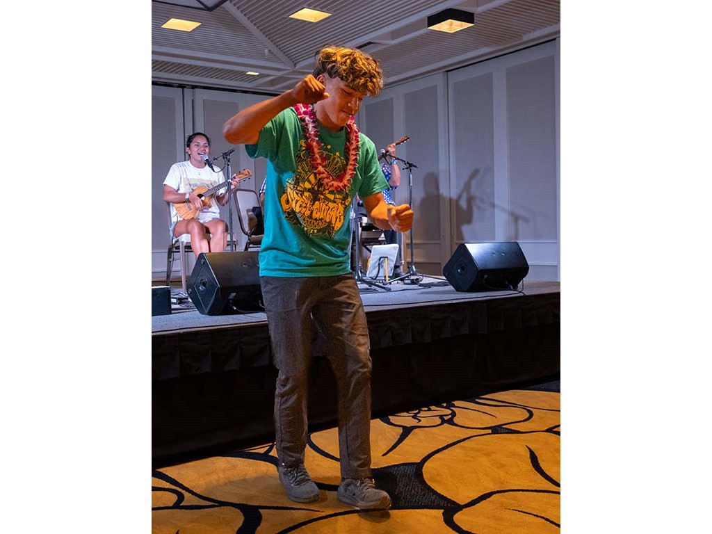 NextGen steel guitarist Enosa Lyman sings Blue Hawaiian Moonlight, accompanied by NextGen Hiʻipoi Lindsey and Helene Woodward, Alan Akaka, Kaipo Lindsey, and Kaipo Asing.