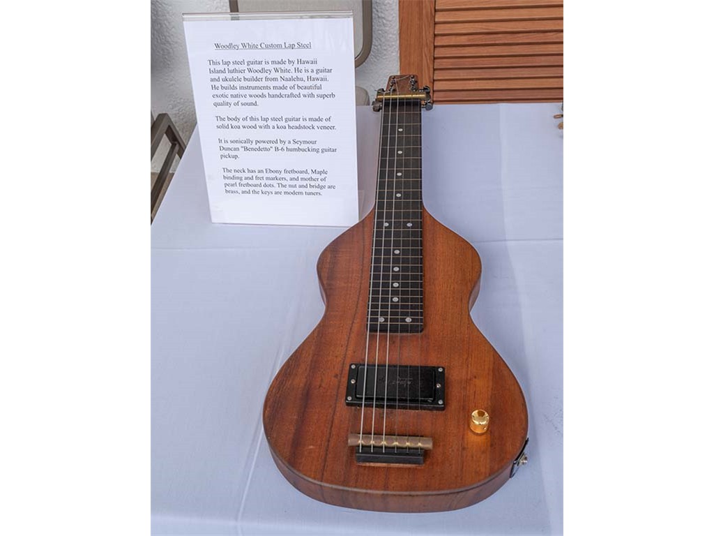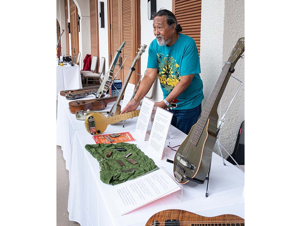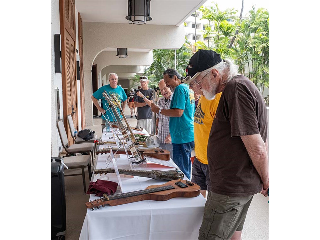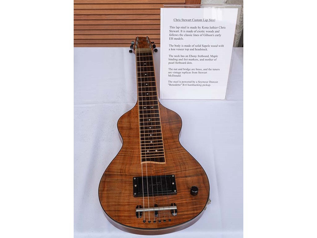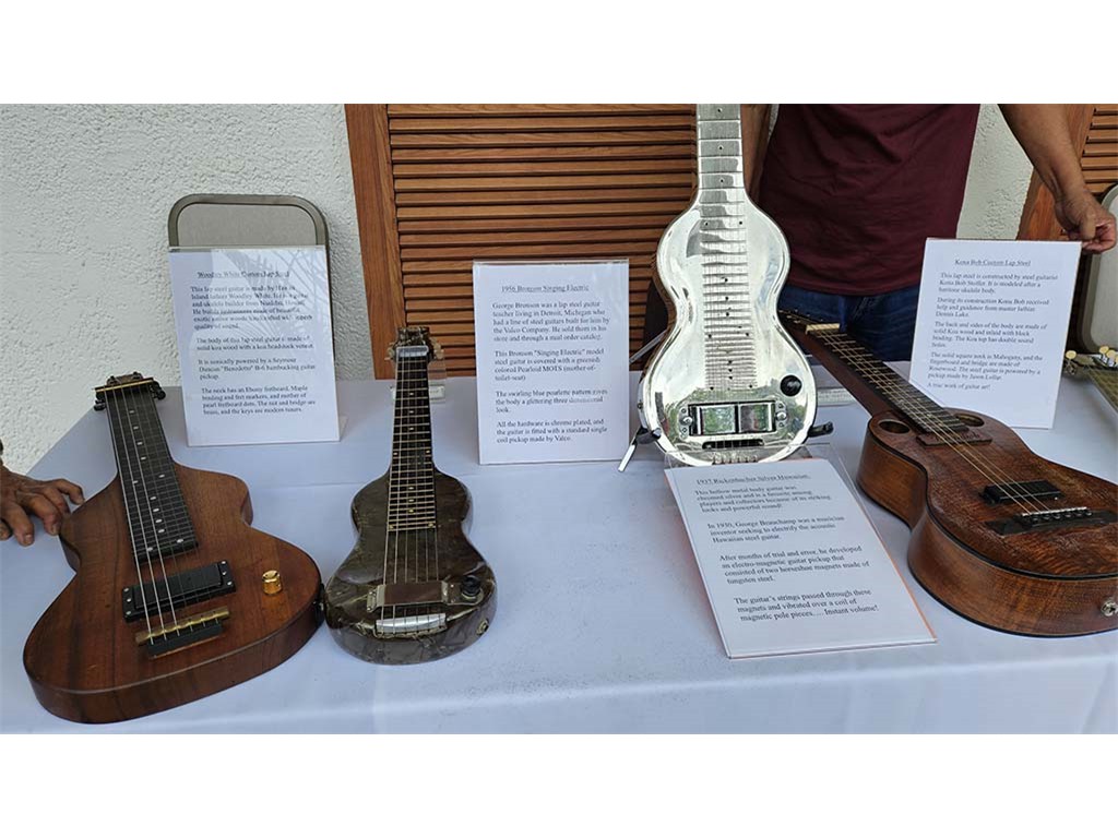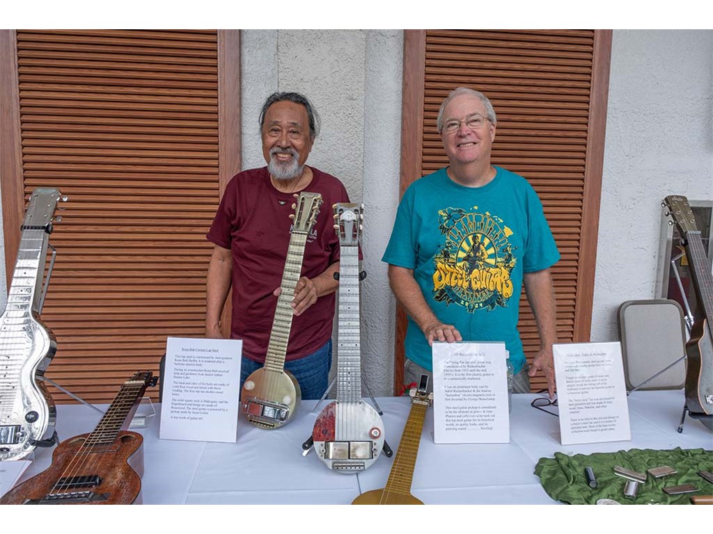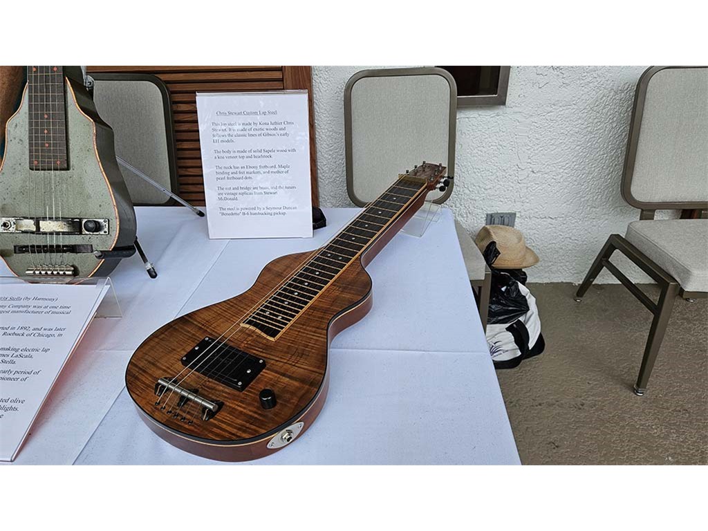 The steel guitar exhibit was located in the Keauhou Ballroom foyer and managed by Geri Valdriz and Chris Stewart. The exhibit included vintage RIckenbacher lap steel guitars as well as custom-crafted lap steel guitars made by Hawai‘i Island luthiers Chris Stewart, Konabob Stoffer, and Woodley White.