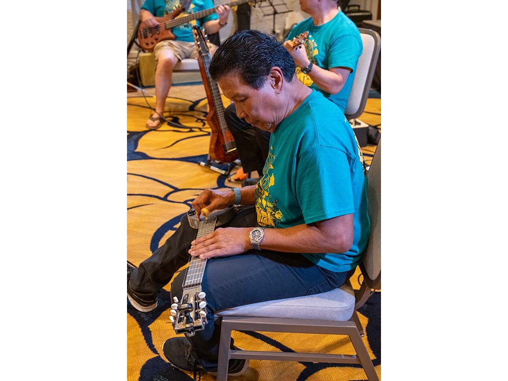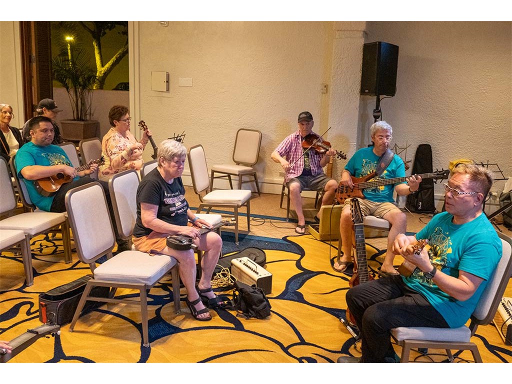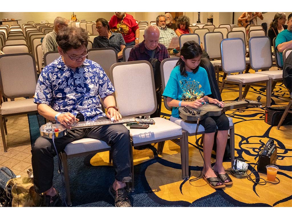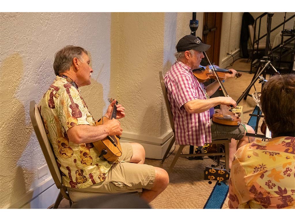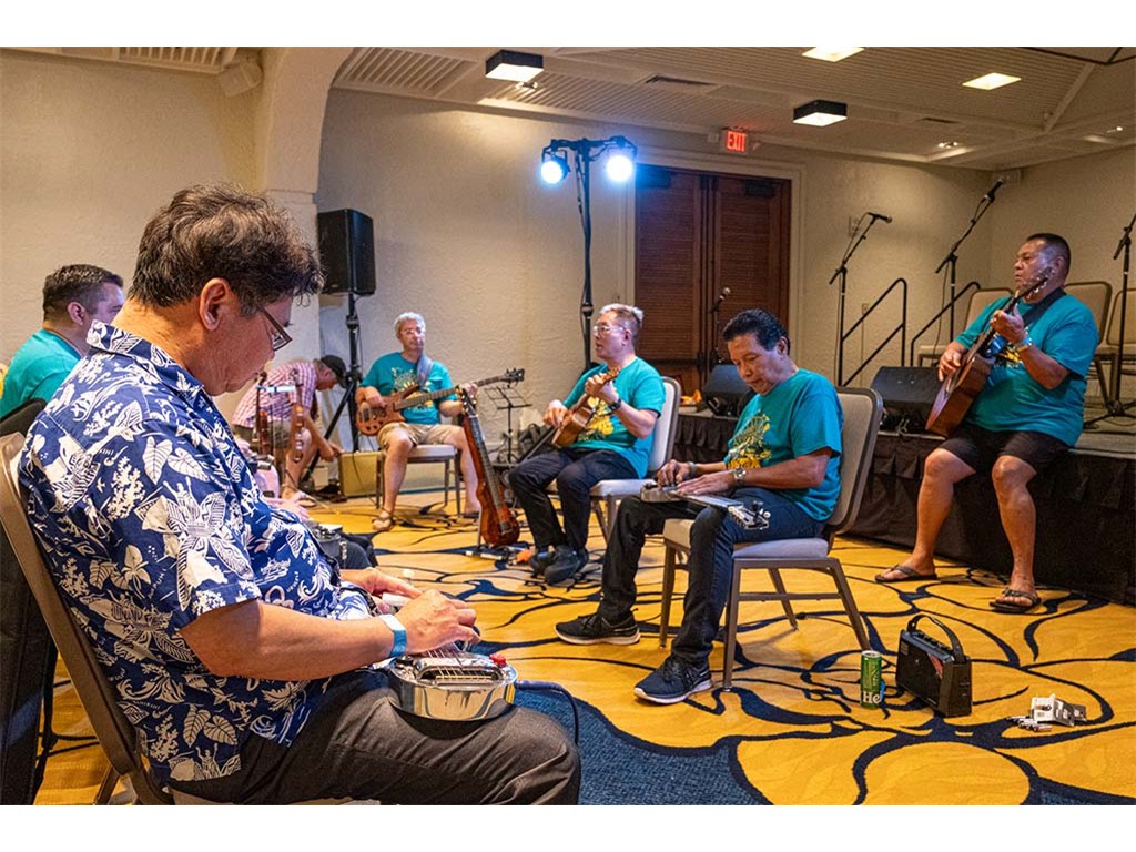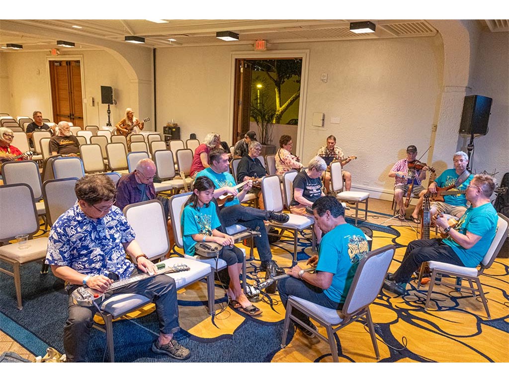 The Friday Evening Kanikapila was well attended by festival musicians, steel guitarists, other musicians and festival guests who just wanted to watch and enjoy the music. In addition to steel guitars, guests played guitar, ‘ukulele, and fiddle. A few guests brought multiple instruments to play.