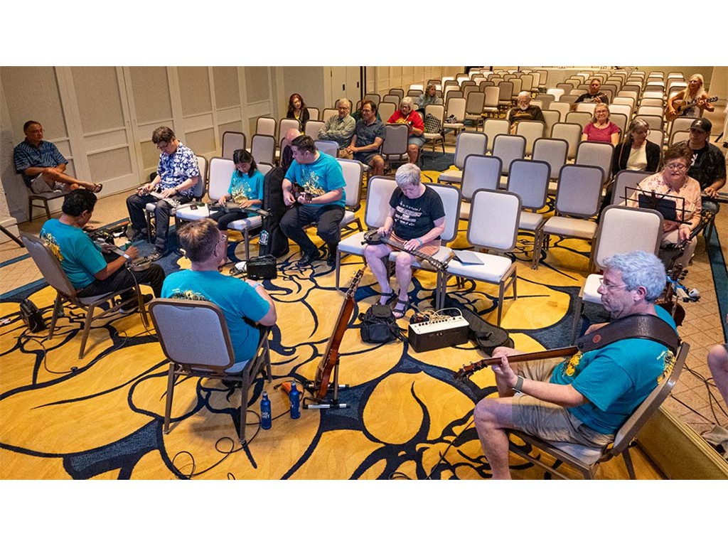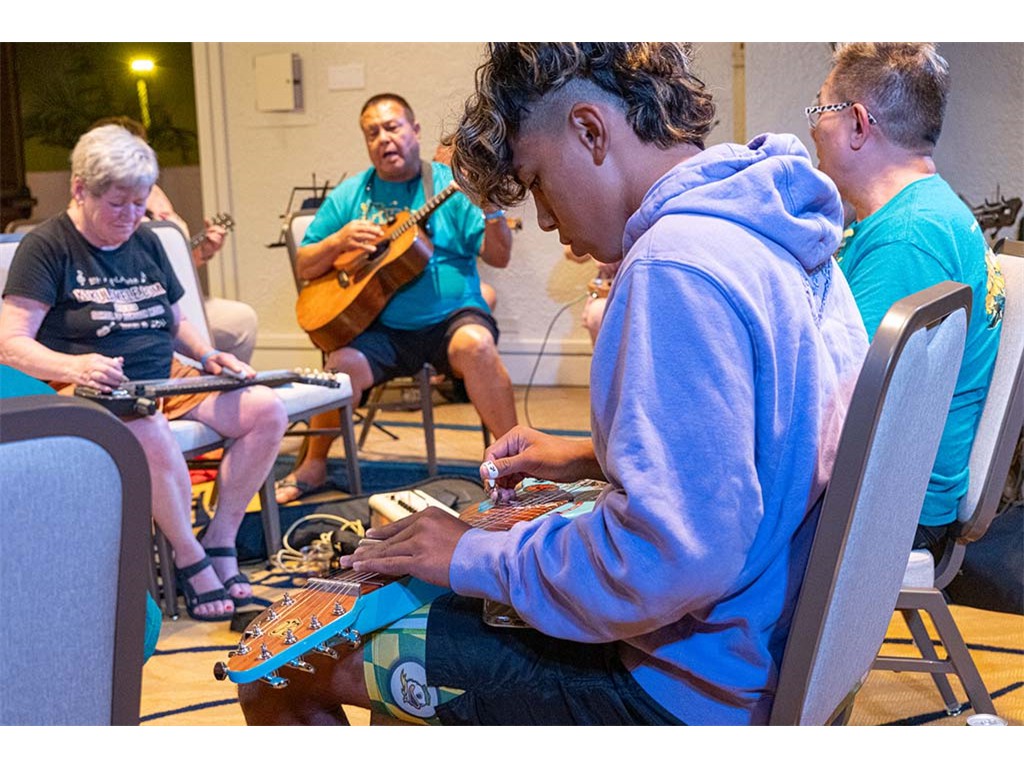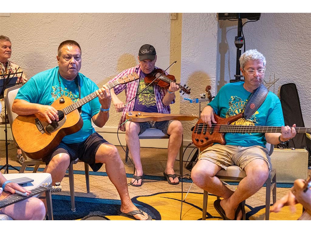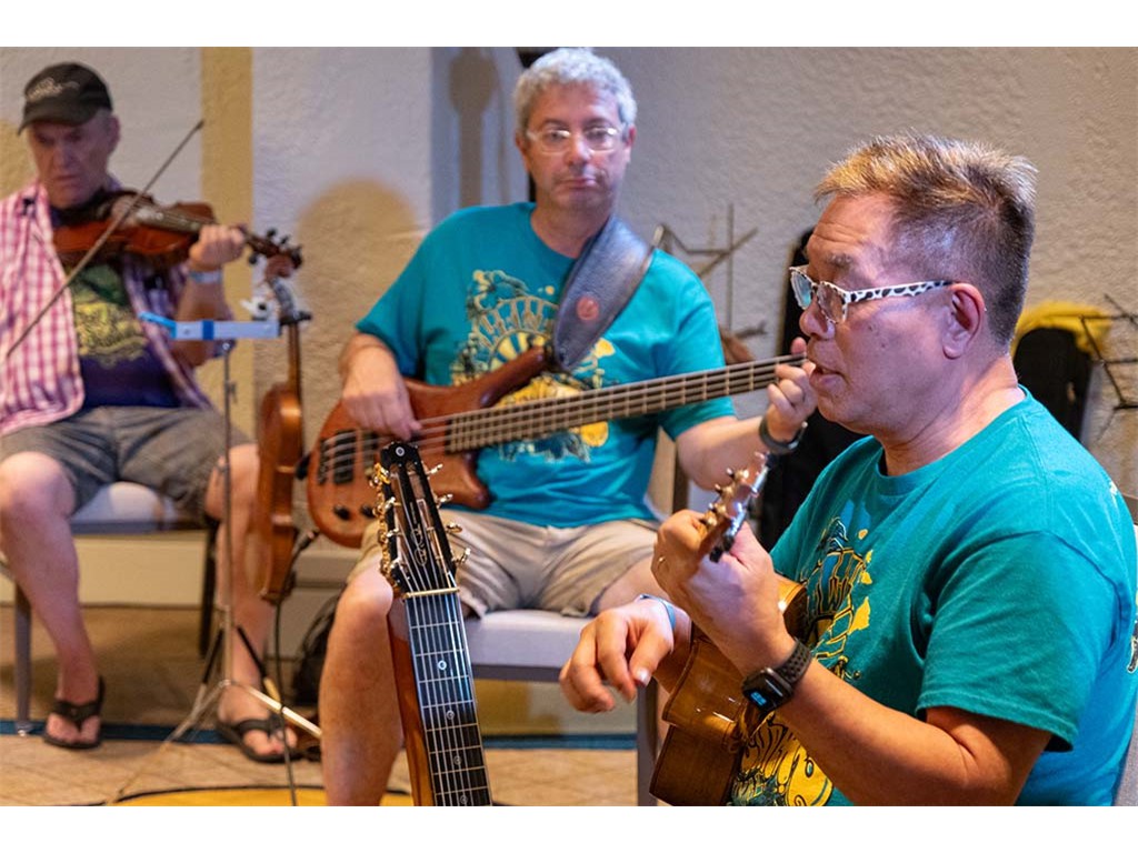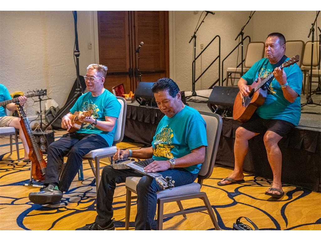 The Friday Evening Kanikapila was well attended by festival musicians, steel guitarists, other musicians and festival guests who just wanted to watch and enjoy the music. In addition to steel guitars, guests played guitar, ‘ukulele, and fiddle. A few guests brought multiple instruments to play.