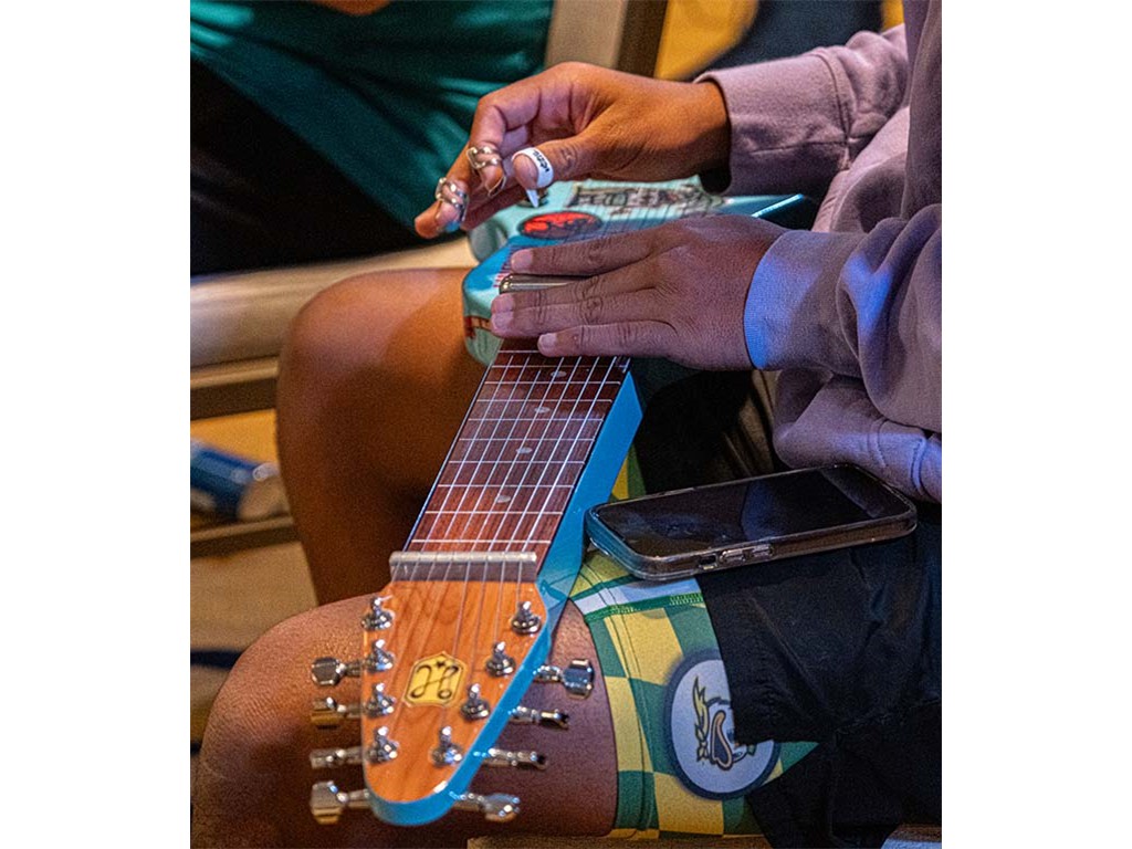 • A festival guest with her guitar.