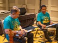 Alan demonstrates a playing technique while Bobby looks on.