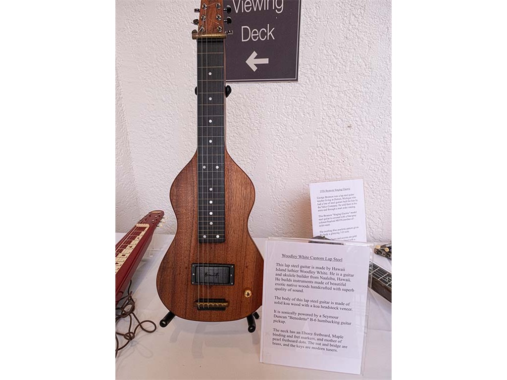 Steel guitars on display: A custom lap steel guitar made by Hawaiian luthier Woodley White from Naʻalehu, Hawaiʻi.