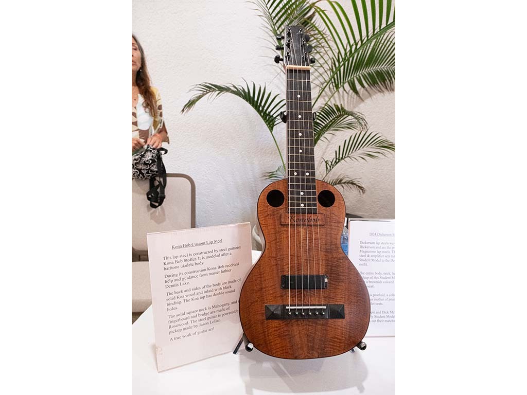 Steel guitars on display: A custom lap steel guitar made by Hawaiian luthier Chris Stewart from Kona.