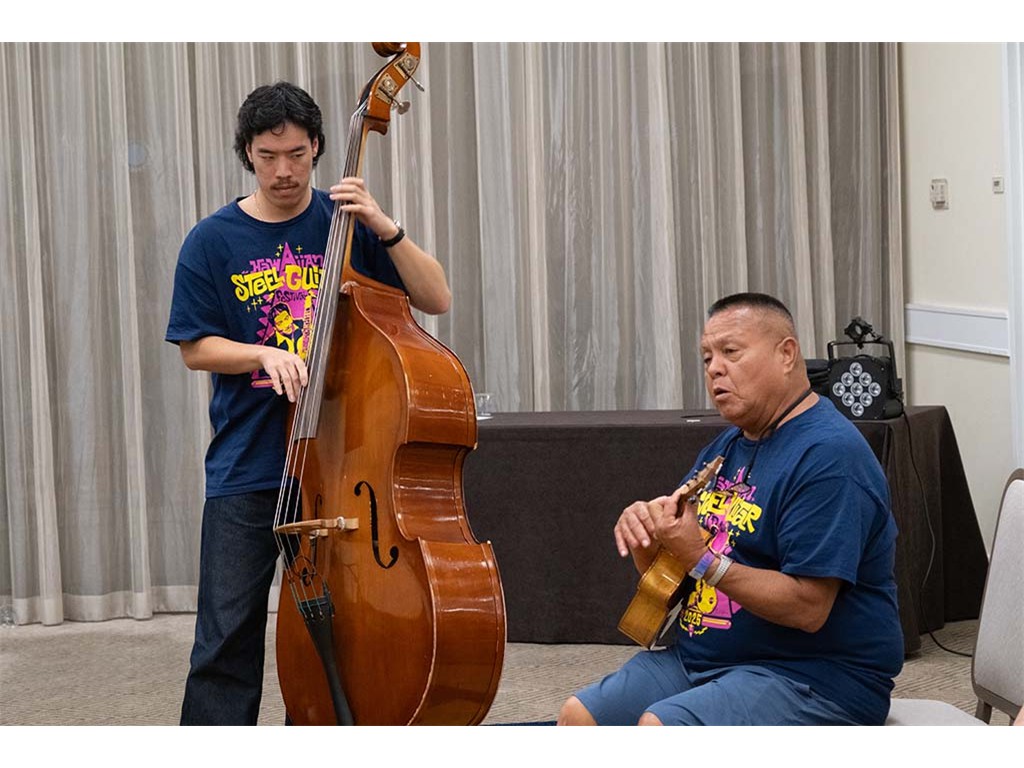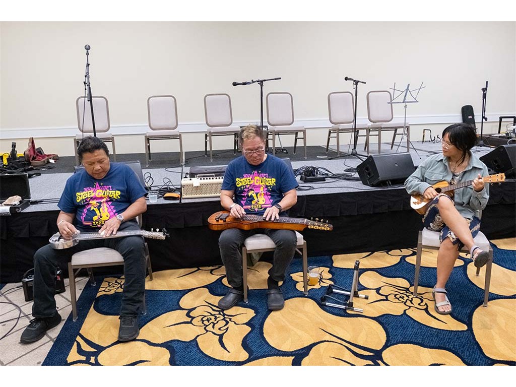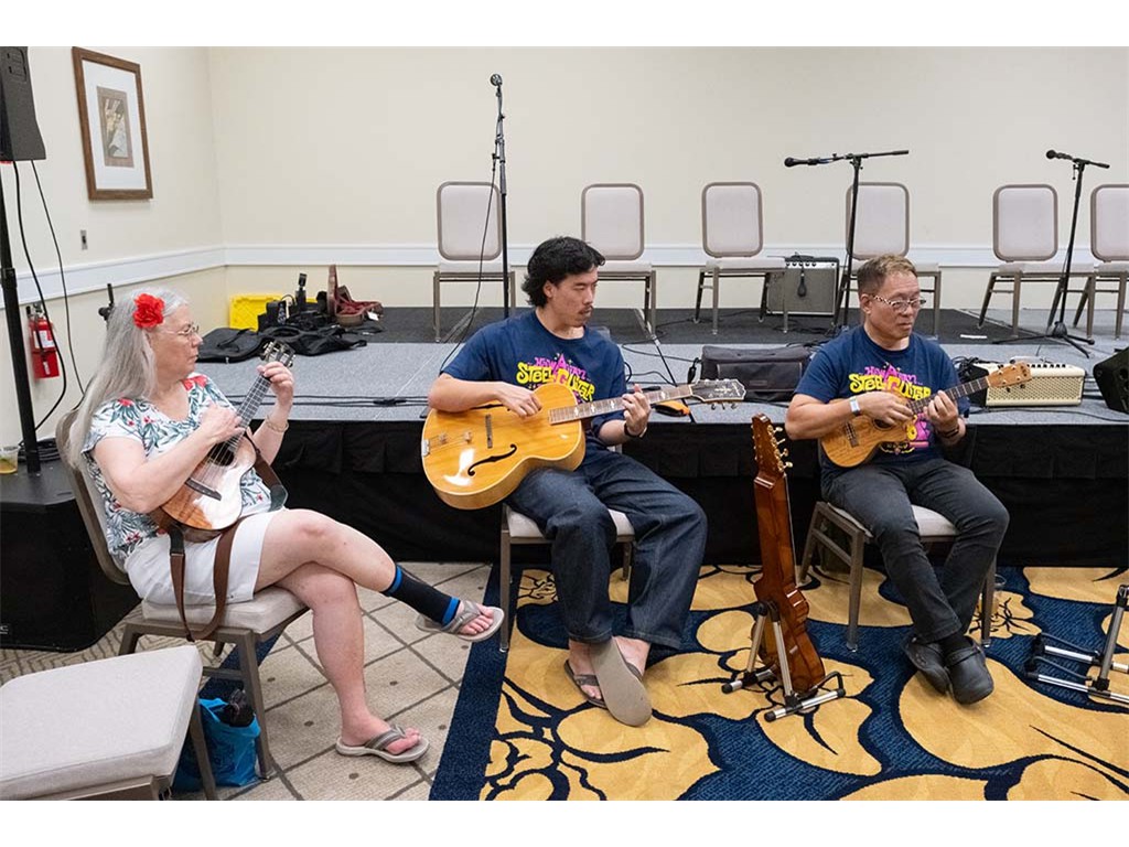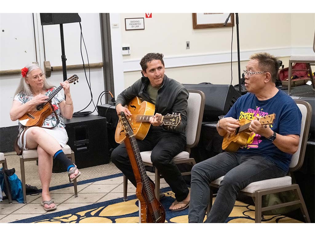 The Friday Evening Kanikapila evolved from the workshop held prior to the kanikapila and was well attended by festival musicians, steel guitarists, other musicians and festival guests who just wanted to watch and enjoy the music. In addition to steel guitars, guests played guitar, ‘ukulele, and bass, and many musicians switched off on instruments.