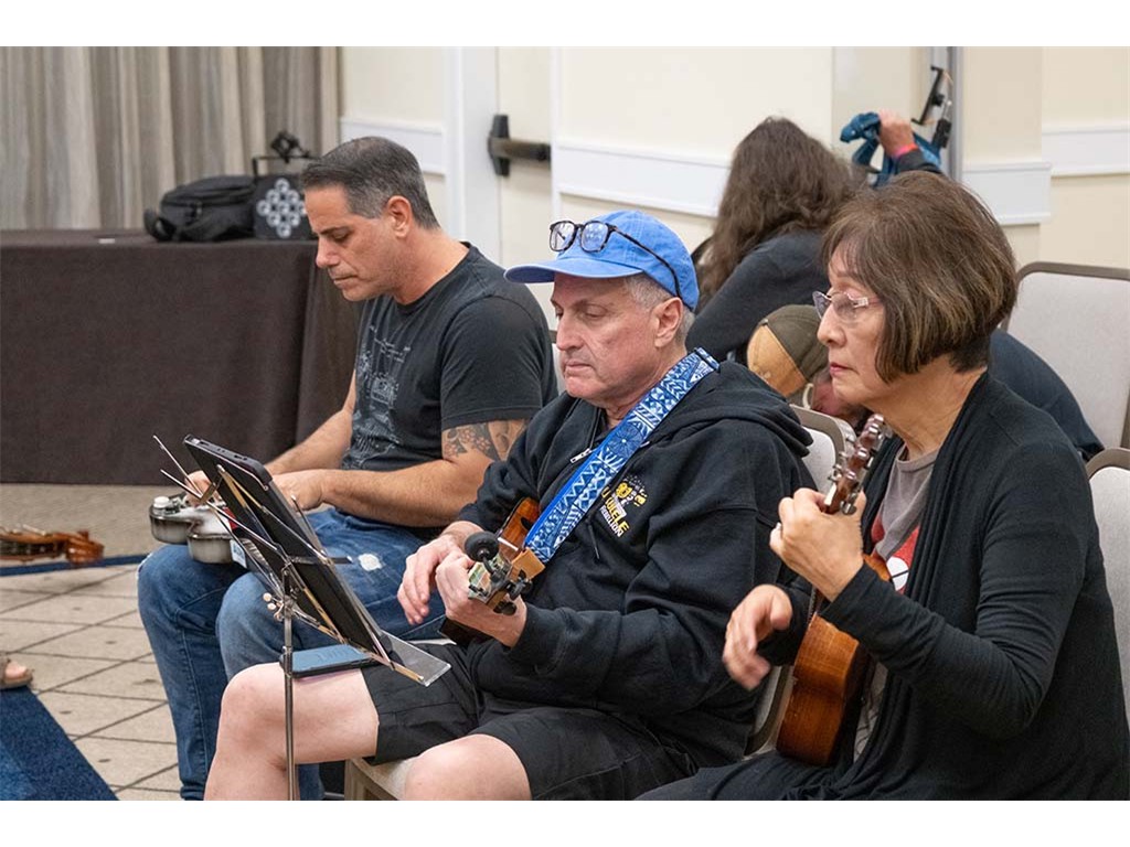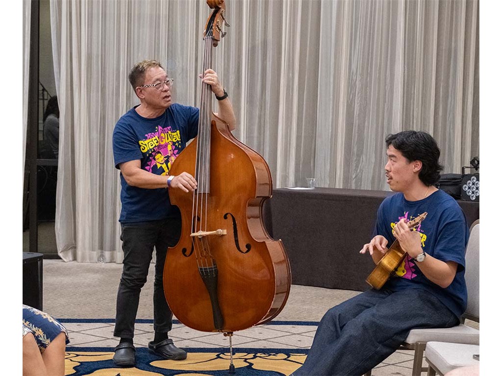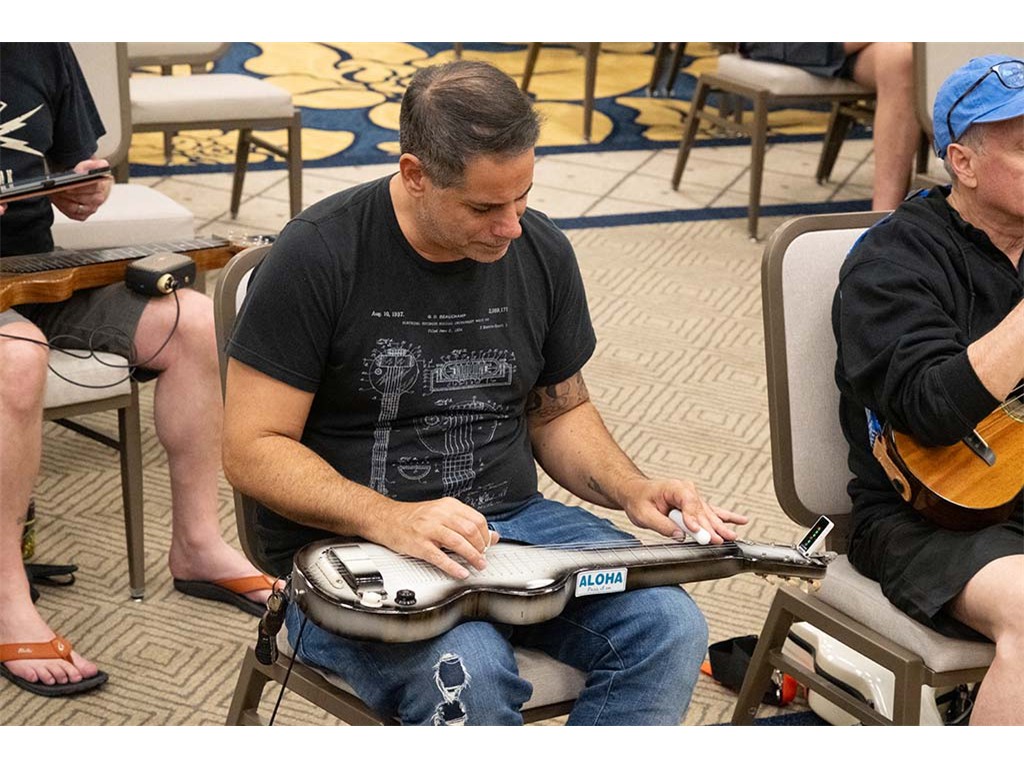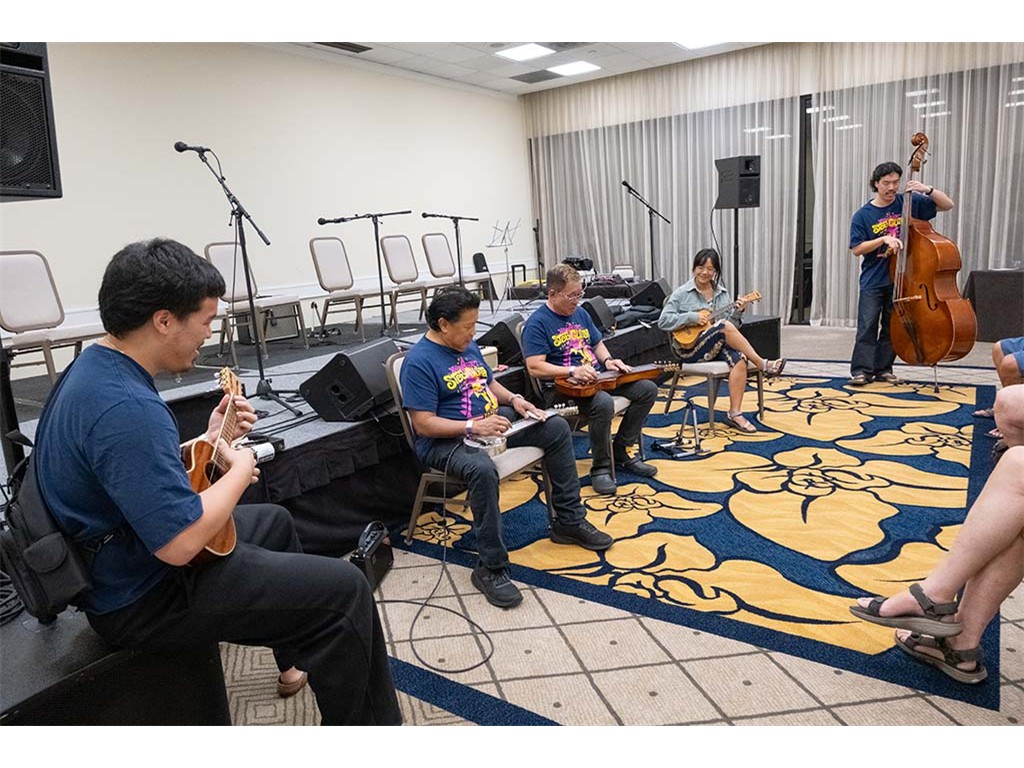 The Friday Evening Kanikapila evolved from the workshop held prior to the kanikapila and was well attended by festival musicians, steel guitarists, other musicians and festival guests who just wanted to watch and enjoy the music. In addition to steel guitars, guests played guitar, ‘ukulele, and bass, and many musicians switched off on instruments.
