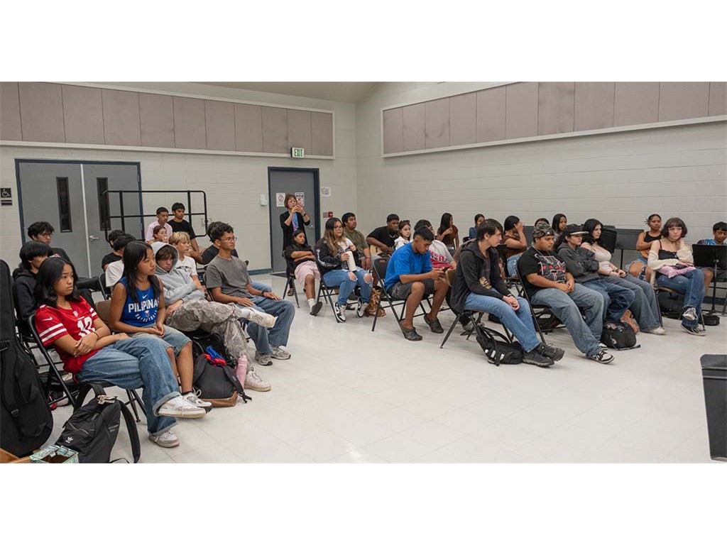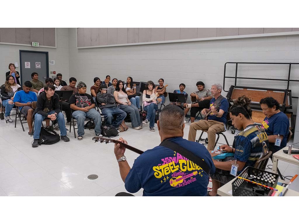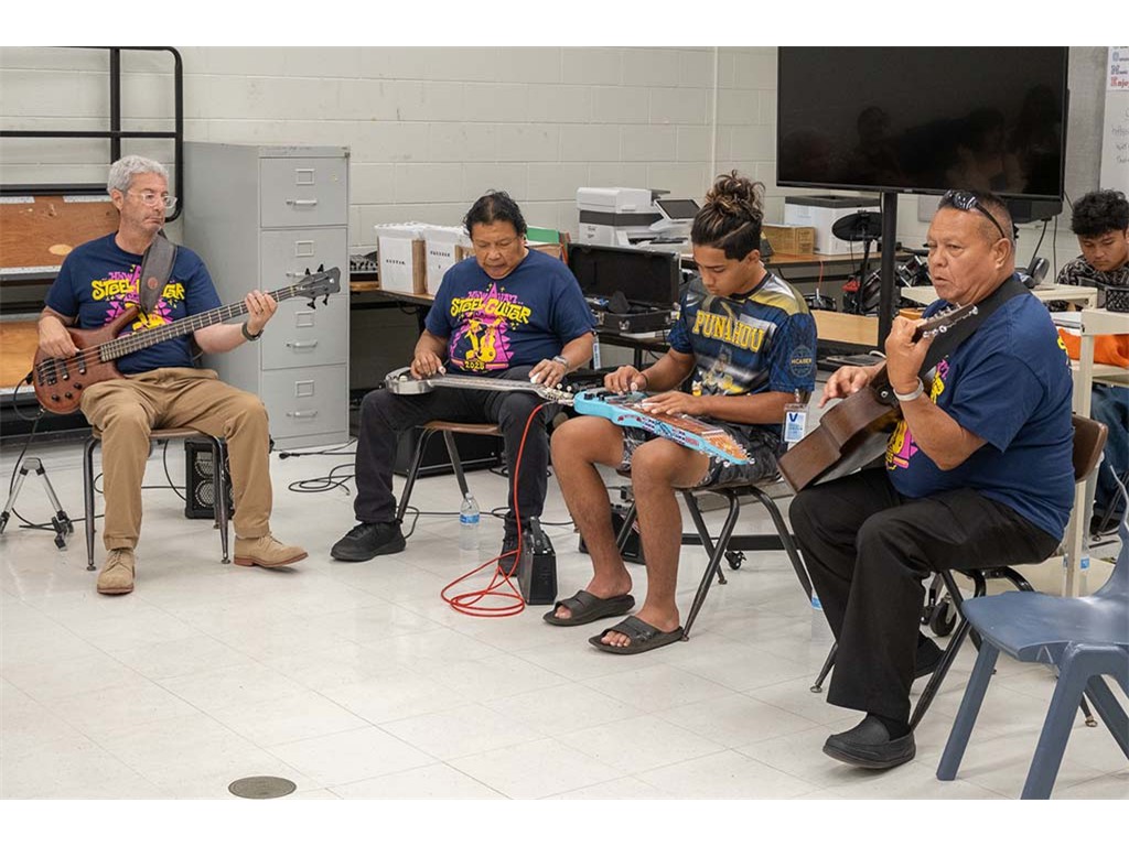 A presentation team comprising Nate Goore, Bobby Ingano, Kaipo Asing, and NextGen Enosa Lyman visited Kealakehe High School. The group gave a presentation to Linda Nagai's class then showed students how to play the steel guitar.