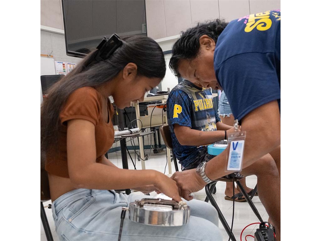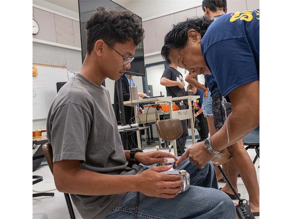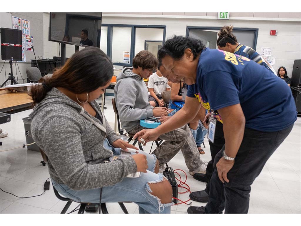 Enosa shows a student how to play the acousitc steel guitar.,