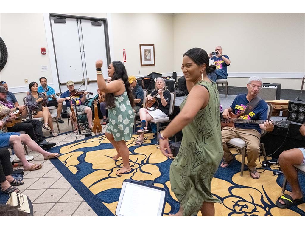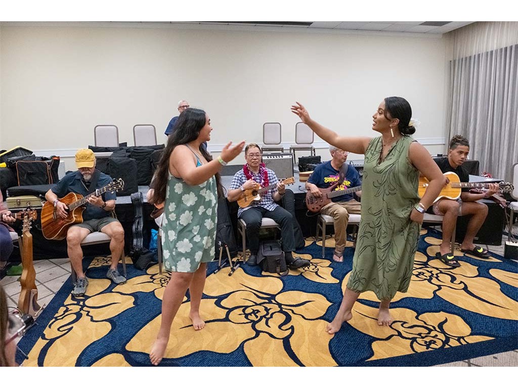 Makamae Lyu-Napoleon and Mālie Lyman doing the hula.