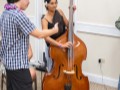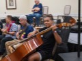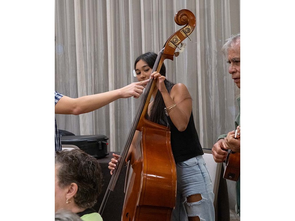 Isabella Bertelmann getting a bass lesson.