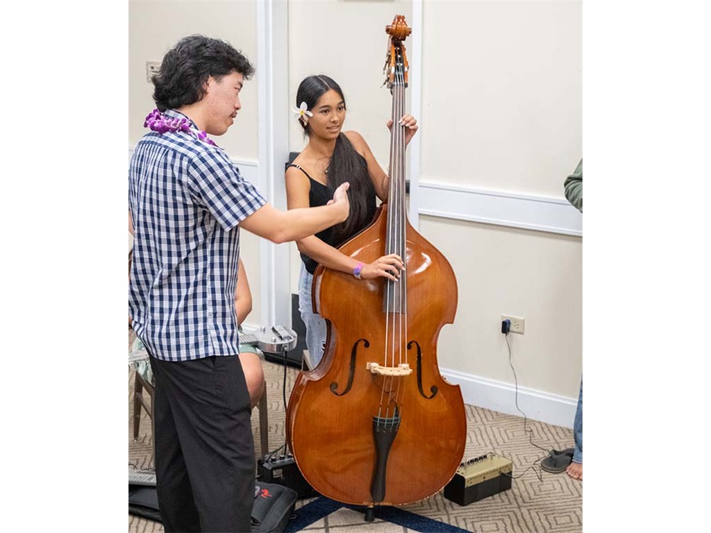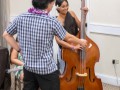 Dylan Nakahara showing Isabella Bertelmann how to play the upright bass.